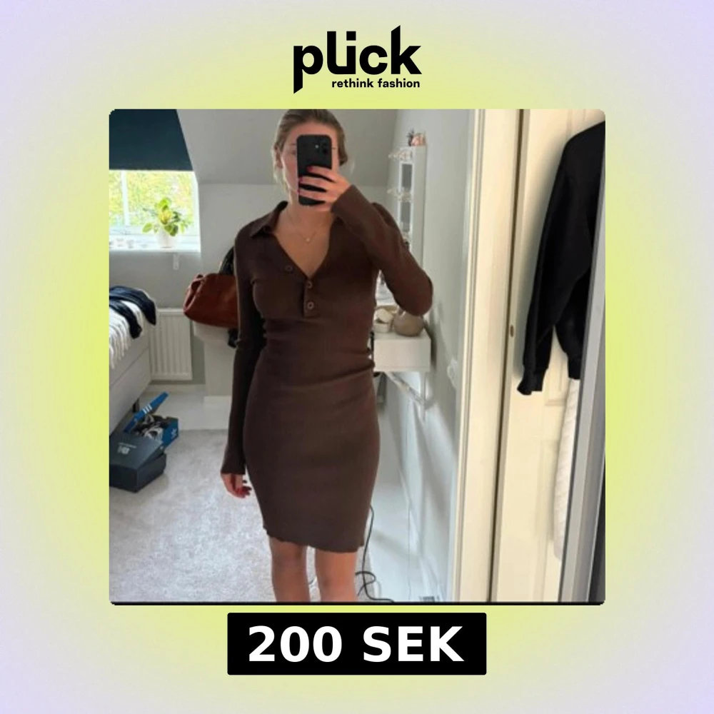 Säljer en tight brun ribbad klänning med lång ärm och snygg v-ringning med knappar framtill. Klänningen har krage och cool detalj med slits och knapp vid ärmslut. Perfekt för dig som gillar en stilren men trendig look.