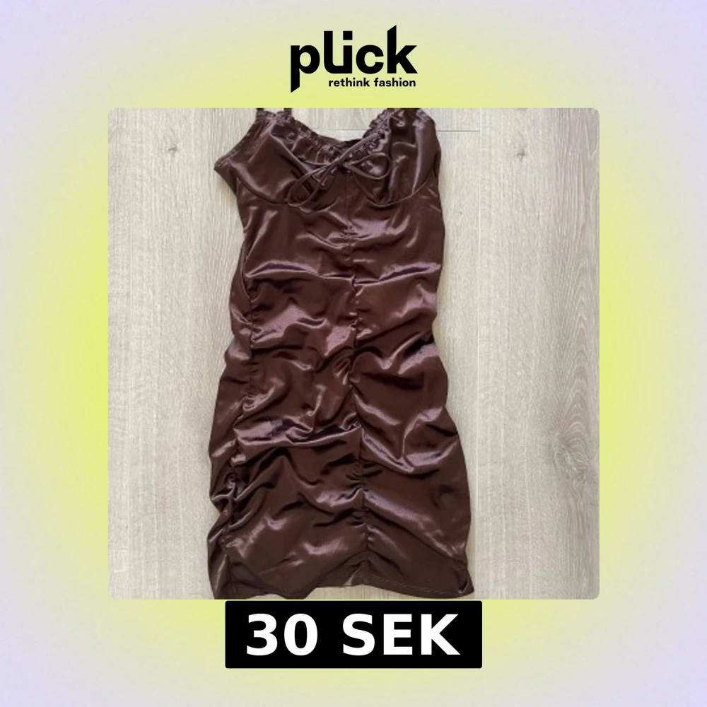 Snygg brun klänning i satin med smala axelband och knytning framtill