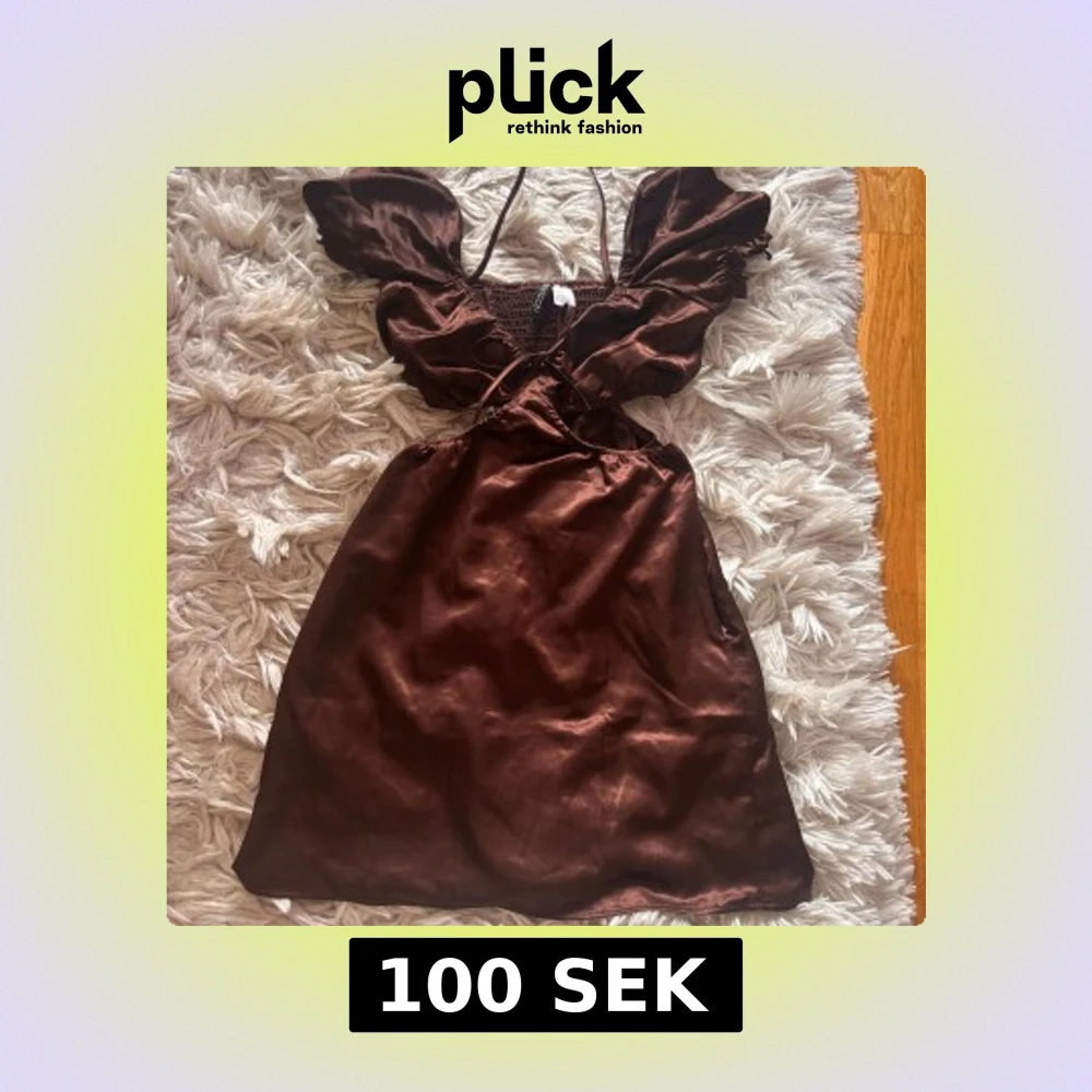 Supersöt brun kortklänning i glansigt satintyg. Klänningen har puffiga kortärmar,