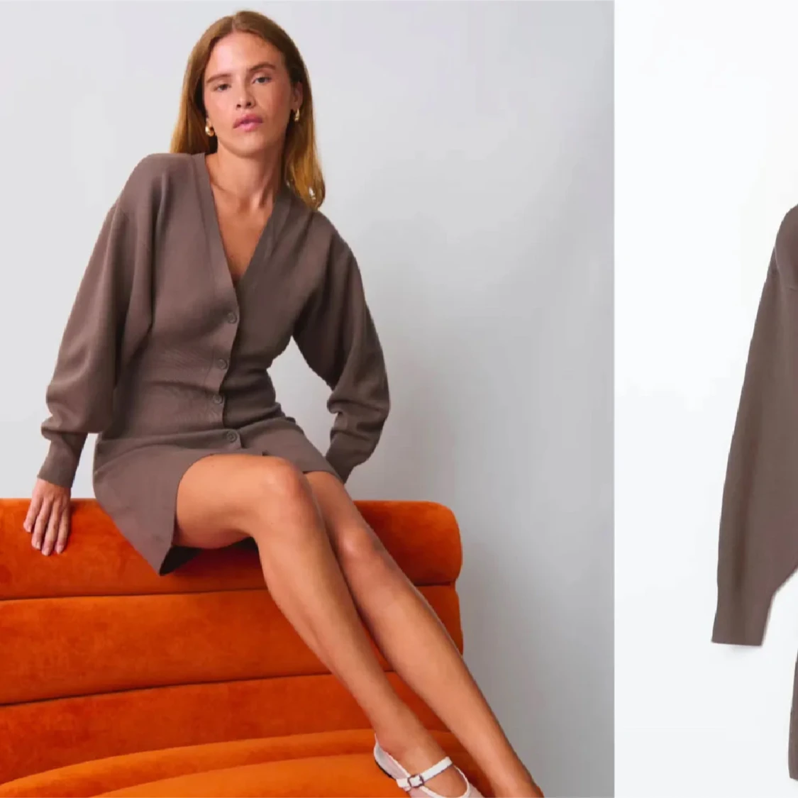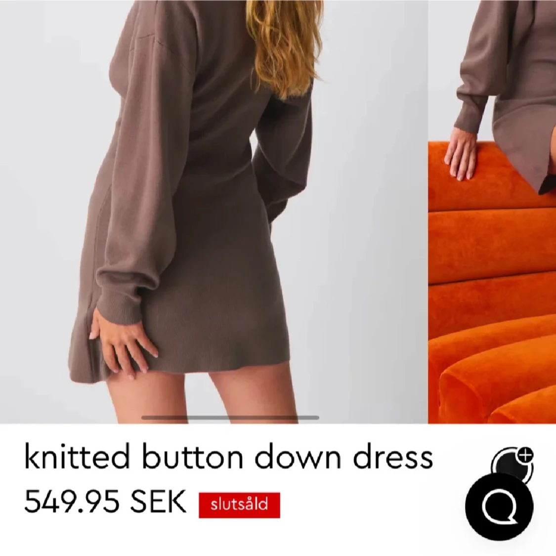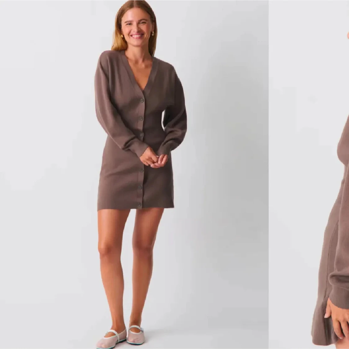 Supersnygg brun stickad klänning med v-ringning och långa ärmar. Klänningen har en rak, kort passform och knappar hela vägen framtill. Perfekt att styla med sneakers eller boots för en chill look.
