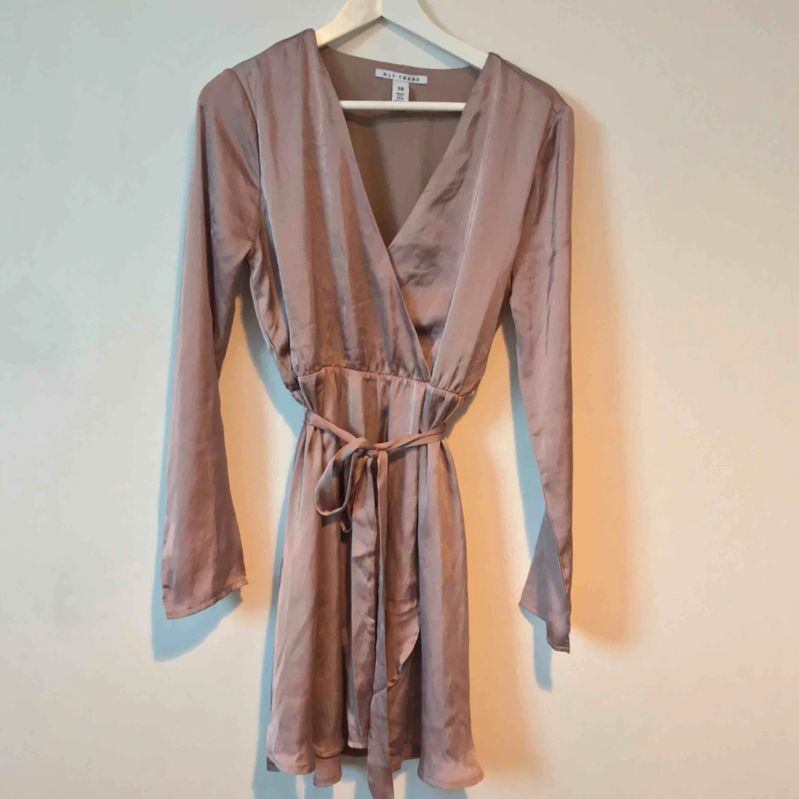 Snygg champagne färgad klänning🥂 Du kan knyta ta bord banden i midjan om du vill. I bra skick förutom att några trådar har gått av vid bröstet (sista bilden) dock syns det inte alls. Den är ganska liten i ärmarna. Möts upp i Gävle eller fraktar för 36kr