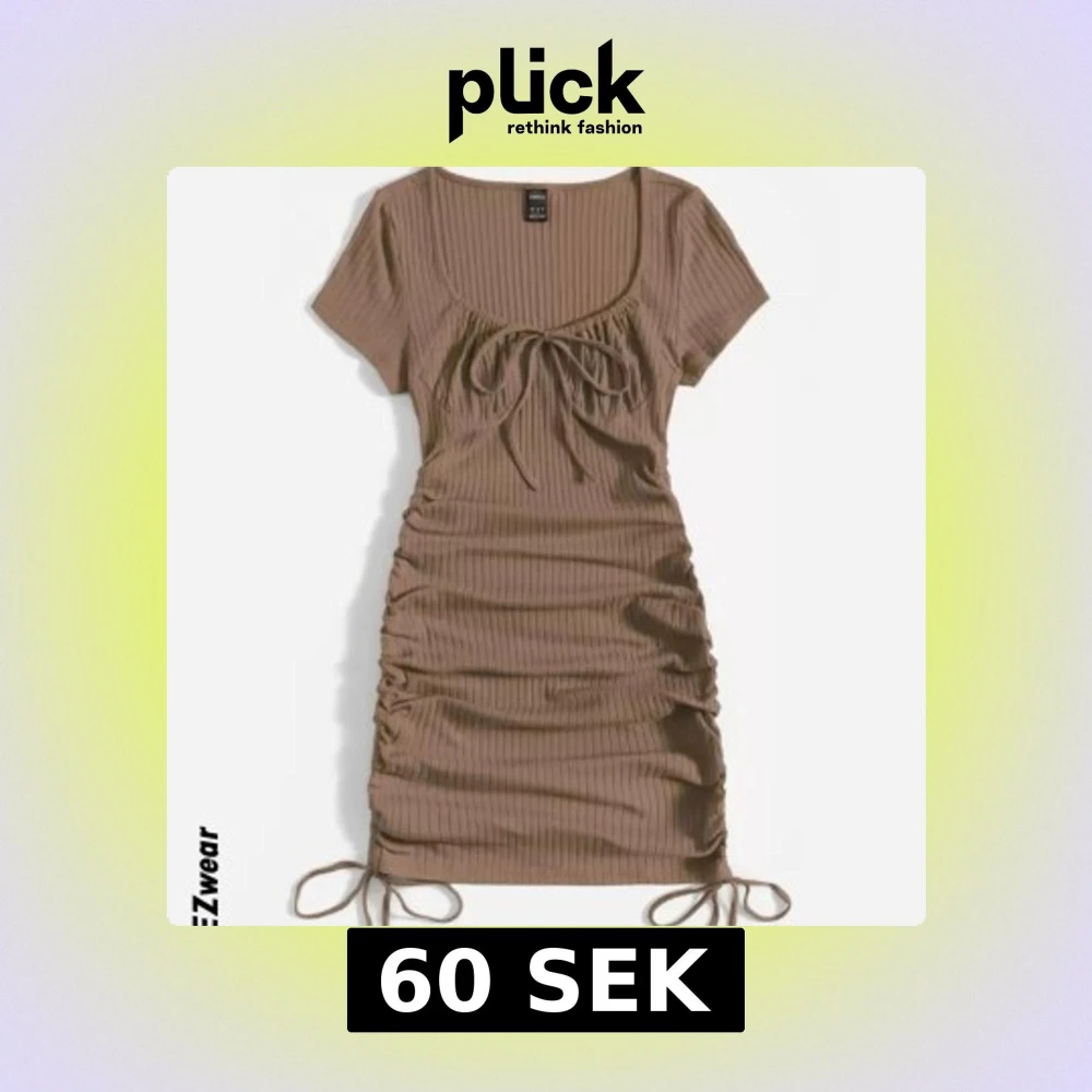 Snygg brun ribbad klänning med korta ärmar och knytning framtill. Klänningen har en åtsittande passform med rynkade detaljer på sidorna och justerbara band nedtill. Väldigt stretchig, passar nog upp till L. Perfekt för en sommardag! Köpt för flera år sedan, säljer då jag inte använder. Endast använd 2 gånger! Skriv för fler bilder!