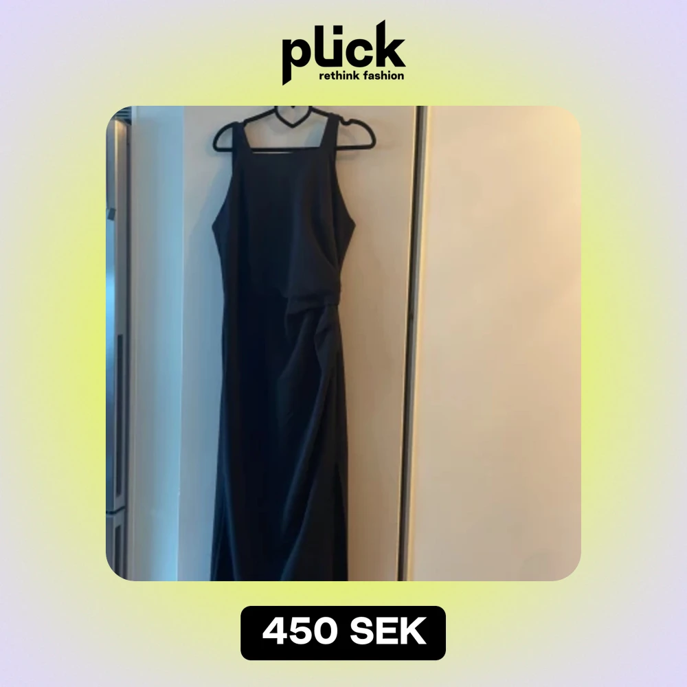 Stilren svart klänning från Bubbelroom. Slits vid sidan, dold ryggdragkedja . Aldrig använd. Köpte den för 799 kr. Yttertyg: 95% polyester, 5% elastan. Foder: 100% polyester.