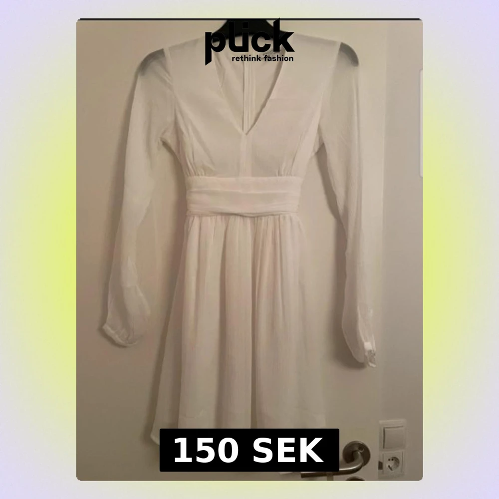 Snygg vit klänning med v-ringning, långärmade transparenta ärmar och ett brett knytband i midjan som ger en fin siluett. Kjolen är lätt utställd och klänningen har dragkedja i ryggen. Perfekt för sommarens alla tillfällen.