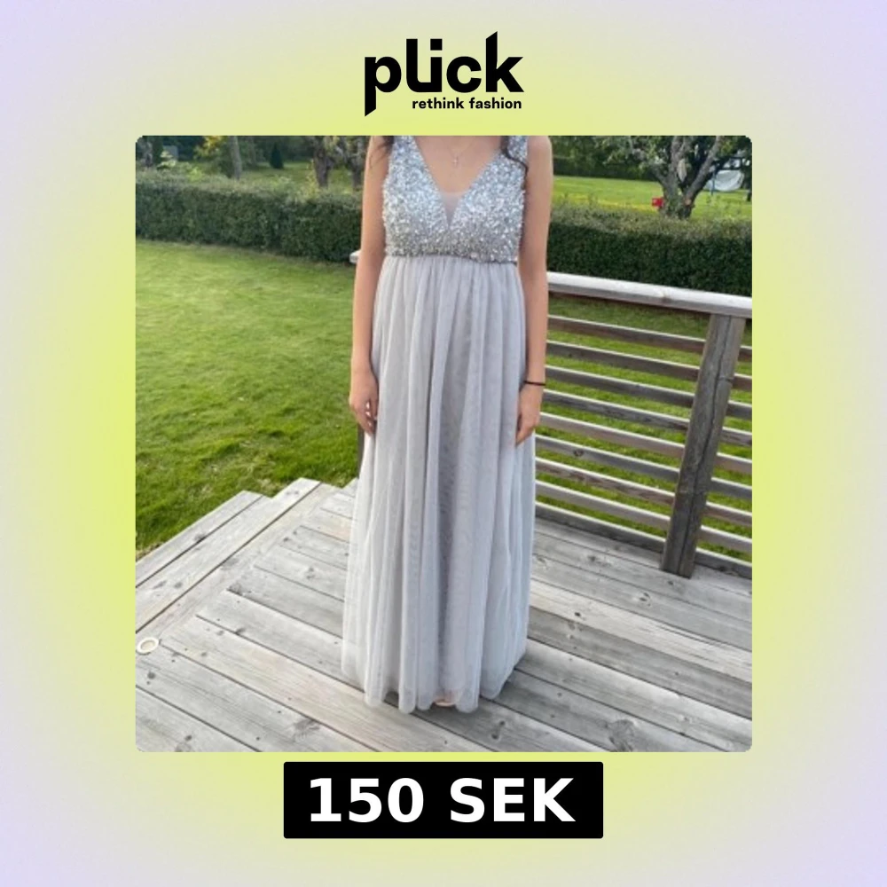 Elegant långklänning i silver med glittrande paljetter upptill och en v-ringad design. Klänningen har en luftig kjol i ett lätt material som ger en vacker fall.
