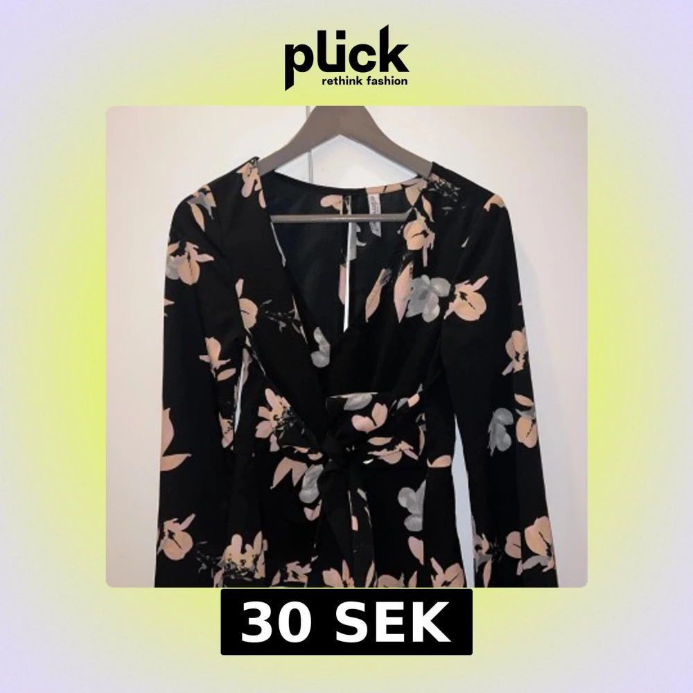 Elegant svart klänning med blommönster i rosa och grått. Klänningen har långa ärmar och ett knytband i midjan för en smickrande passform. Perfekt för både vardag och festliga tillfällen.