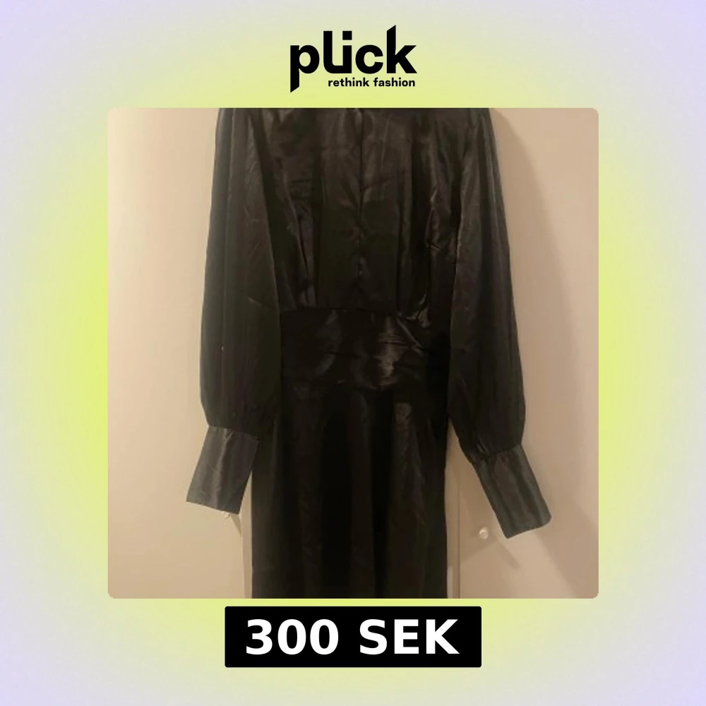 Elegant svart klänning från Bubbleroom i glansigt material. Klänningen har långa ärmar med breda manschetter och markerad midja för en snygg siluett. Perfekt för dig som vill sticka ut med en stilren look.