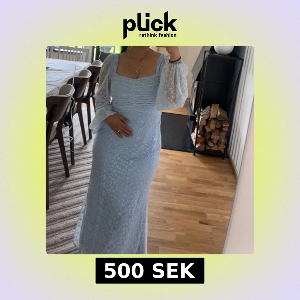 Säljer en ljusblå långklänning med transparenta, puffiga långärmar och vackert spetsmönster som jag bara använt en gång! Klänningen har en fyrkantig urringning och figurnära passform. Perfekt för dig som vill ha en romantisk och feminin look. Passar som gästklänning till bröllop eller födelsedagsfest