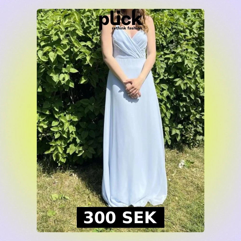 Elegant ljusblå långklänning med omlottdesign upptill och tunna axelband. Klänningen har v-ringning och fina spetsdetaljer på sidorna. Perfekt för speciella tillfällen och studentfirande.