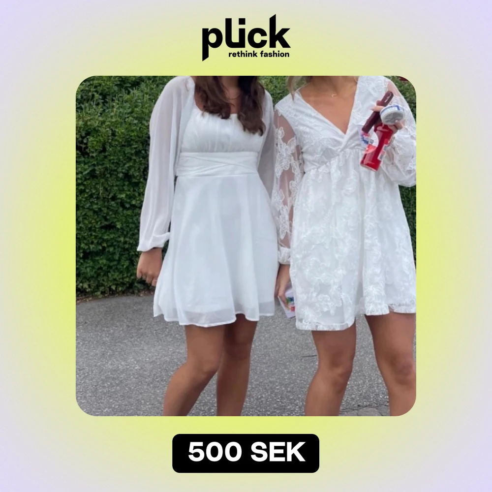 Säljer en superfin studentklänning med långa ärmar och en söt rosett i bak. Klänningen har en luftig passform och är gjord i ett lätt material. Den har en fyrkantig urringning och ett brett midjeband som framhäver figuren.