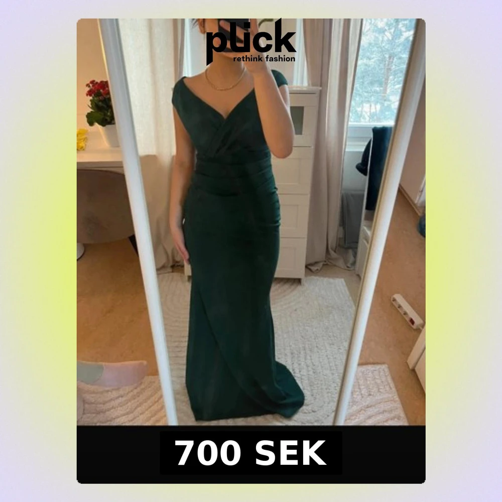 Snygg mörkgrön långklänning med omlott-detalj och v-ringning. Klänningen har korta ärmar och figurnära passform som framhäver siluetten. Perfekt för dig som vill sticka ut med en elegant och stilren look.