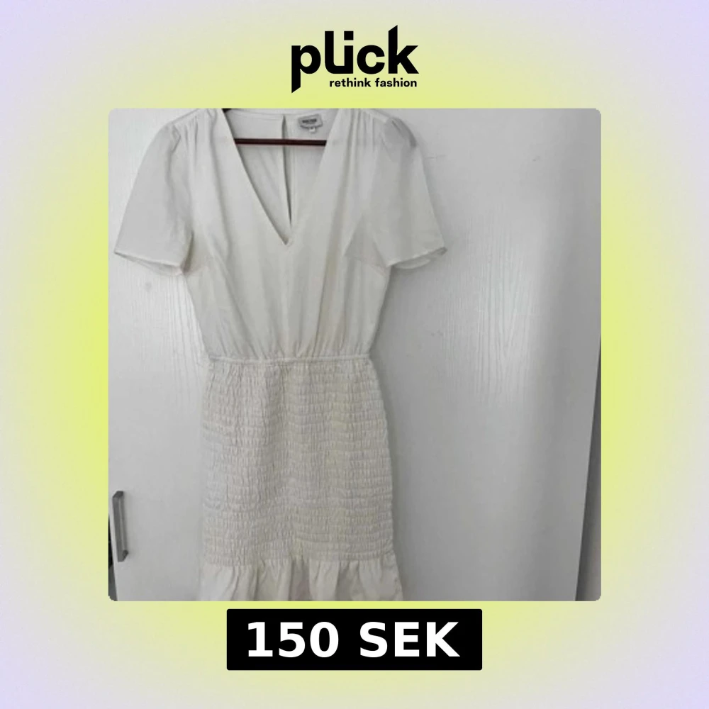 Söt vit klänning med v-ringning och korta ärmar från Bubbelroom. Klänningen har smockad midja och volang nertill, vilket ger en feminin siluett. Perfekt för varma dagar och somriga tillfällen.