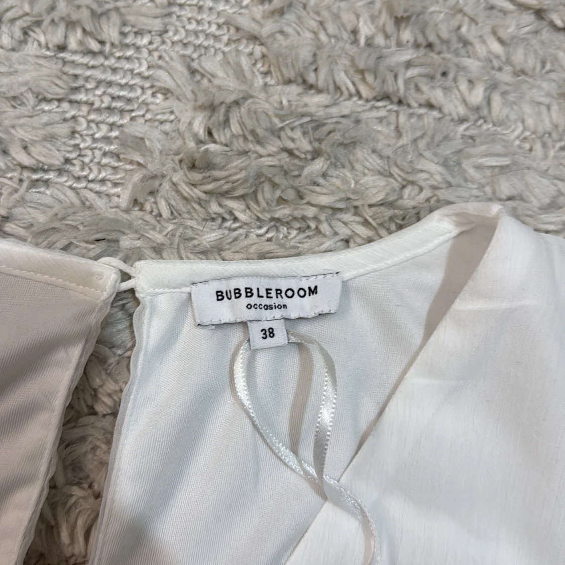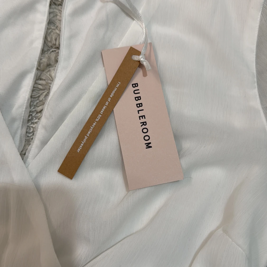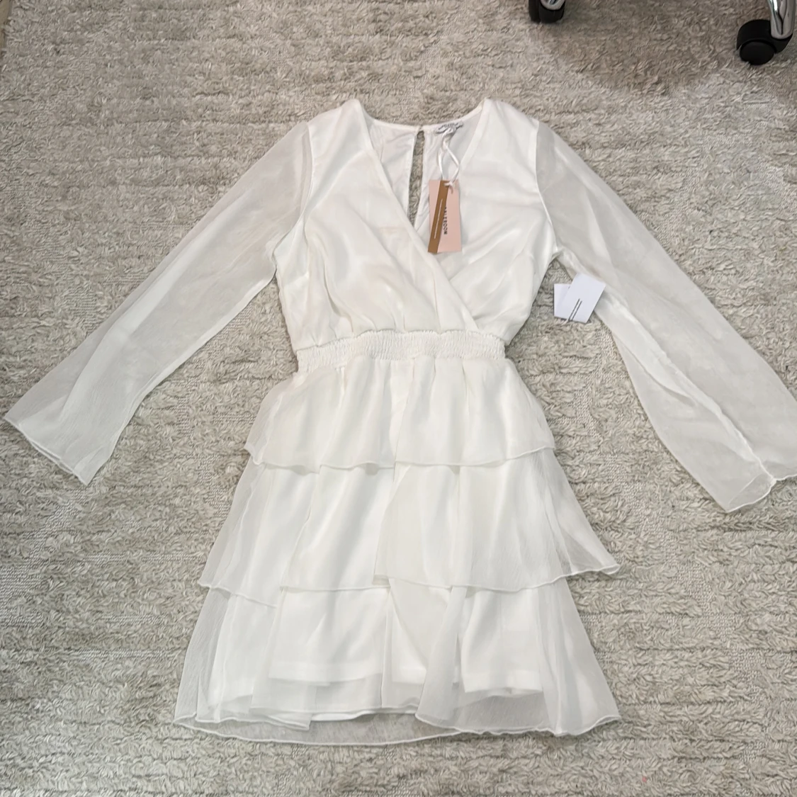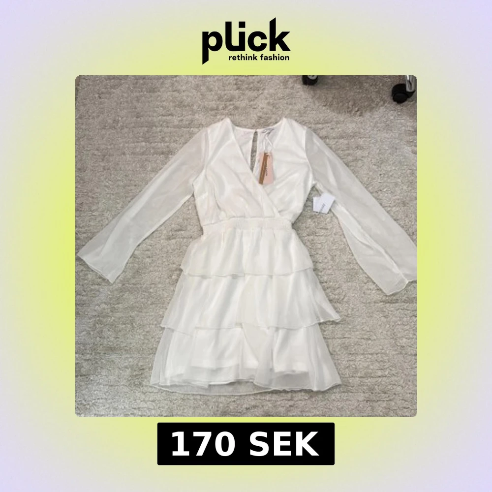 Supersöt vit kortklänning från Bubbleroom med omlottliv, långa transparenta ärmar och flera lager volanger i kjolen. Perfekt för dig som gillar romantisk stil och vill ha något extra till vår eller sommar. Klänningen har v-ringning och markerad midja.