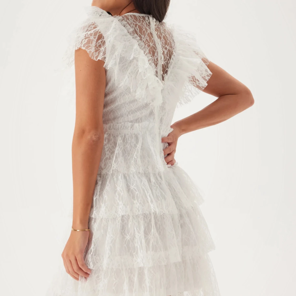 Superfin vit kortklänning i spets med volanger och transparenta detaljer. Enbart använd på stydenten🩷 i mycket fint skick