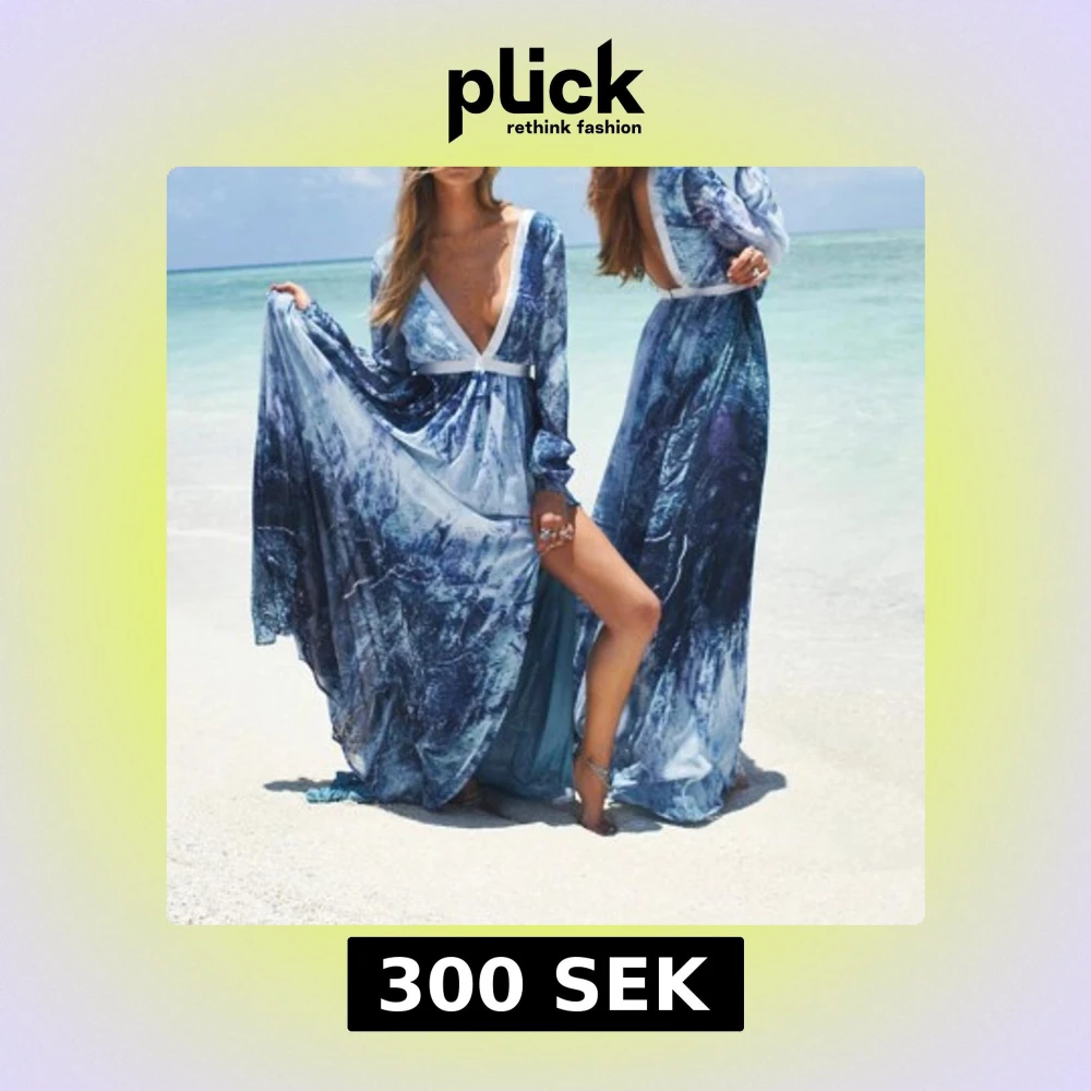Säljer en magisk långklänning i blå toner med coolt mönster som påminner om havet. Klänningen har djup v-ringning, markerad midja med vit kant och långa ärmar. Materialet är lätt och flowy, perfekt för strandhäng eller sommarens alla äventyr.