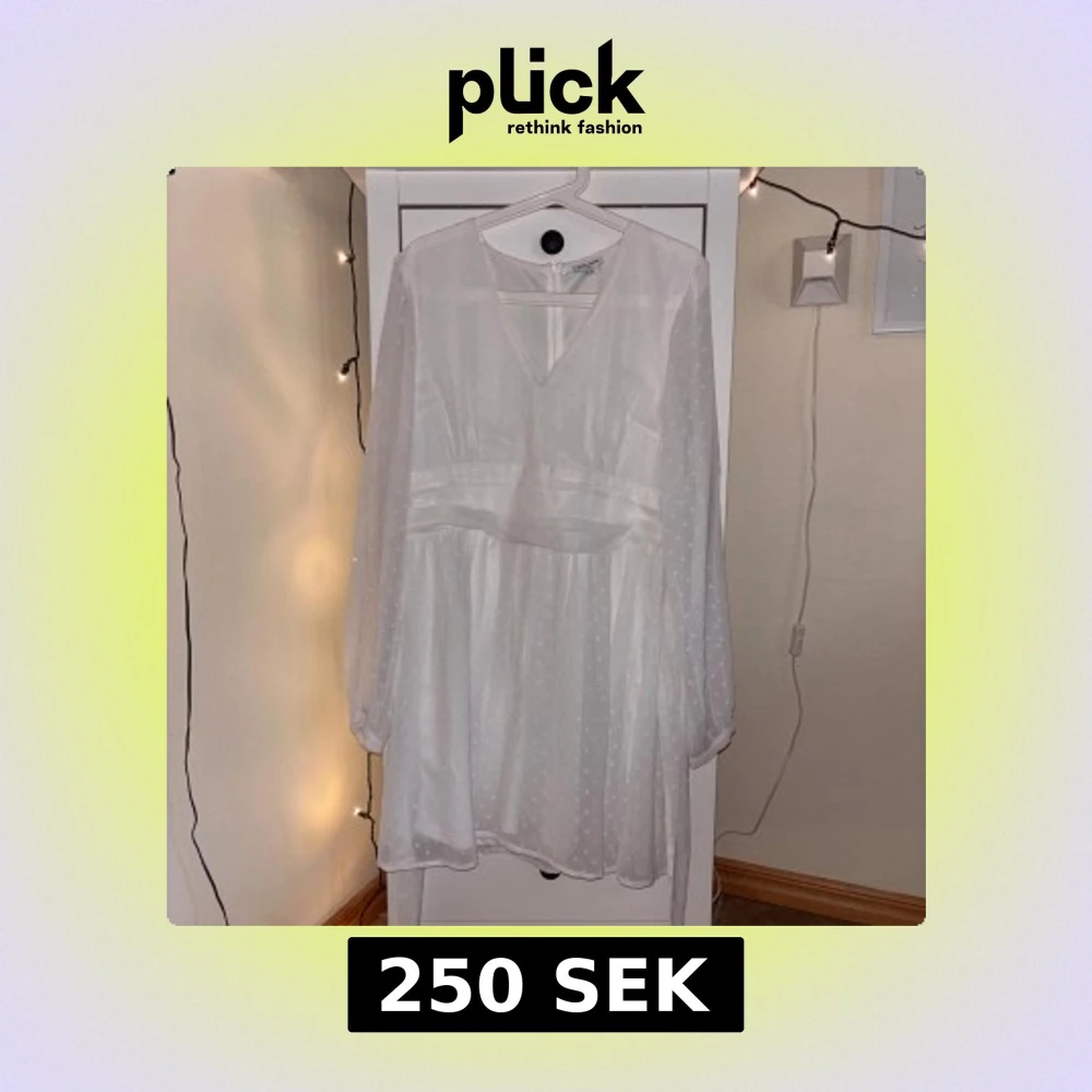 Säljer en elegant vit klänning från Bubbleroom med v-ringning och långa ärmar. Klänningen har ett subtilt prickigt mönster och en dragkedja i ryggen. Perfekt för studenten ! ✨
