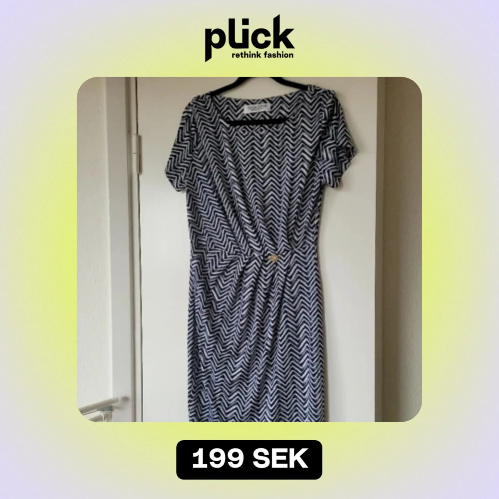 Fin vardags/Midiklänning marin/vit i klassiskt mönster. Lagda veck samt resår i midja. Kort ärm. Stretchigt material. Längd ca t knä. Välvårdad, som ny!
