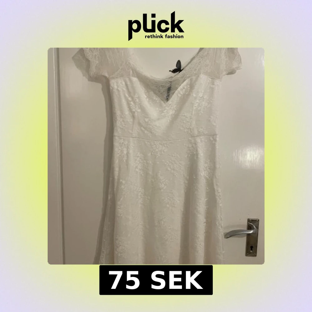 Superfin vit klänning från Bubbleroom med spetsdetaljer och offshoulder-ärm. Klänningen har v-ringning och är figursydd upptill med lätt utsvängd kjol. Perfekt för sommarens alla tillfällen när du vill känna dig extra söt och romantisk.
