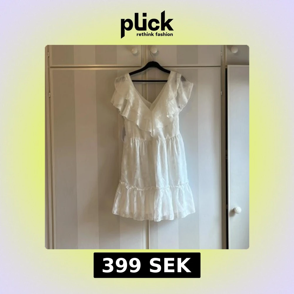 Söt vit klänning med v-ringning och volangdetaljer upptill. Aldrig använd, prislappen finns kvar