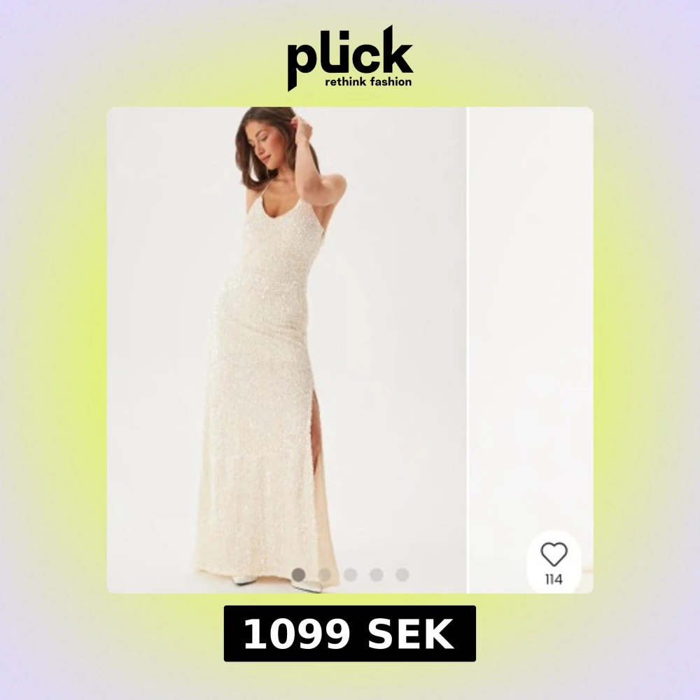 Supersnygg långklänning i champagnefärg med glittriga paljetter över hela tyget. Klänningen har smala axelband, v-ringning och en hög slits på sidan. Perfekt för bal eller nyår, ger en riktigt lyxig känsla och sticker ut i mängden.