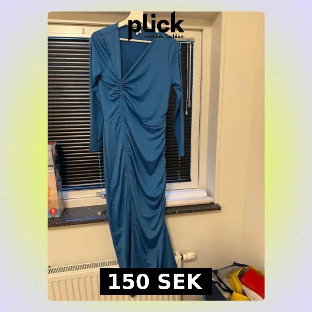 Säljer en blå långklänning från Bubbleroom med v-ringning och rynkdetaljer längs hela framsidan. Klänningen har långa ärmar och är tillverkad i ett mjukt, stretchigt material som ger en snygg passform. Perfekt för dig som vill sticka ut med en elegant look.