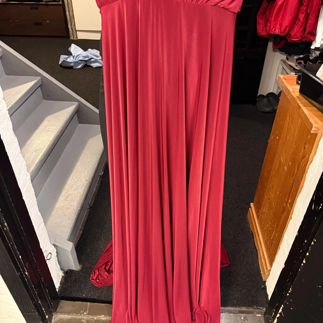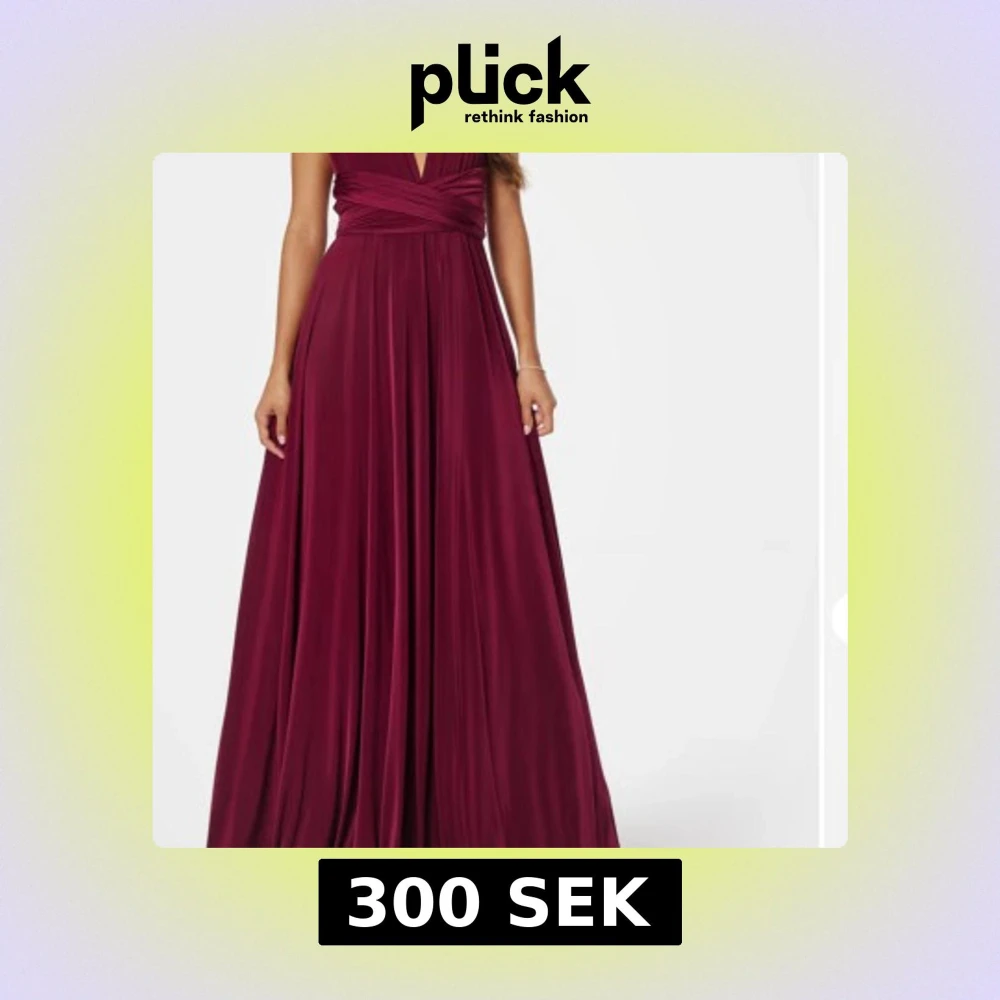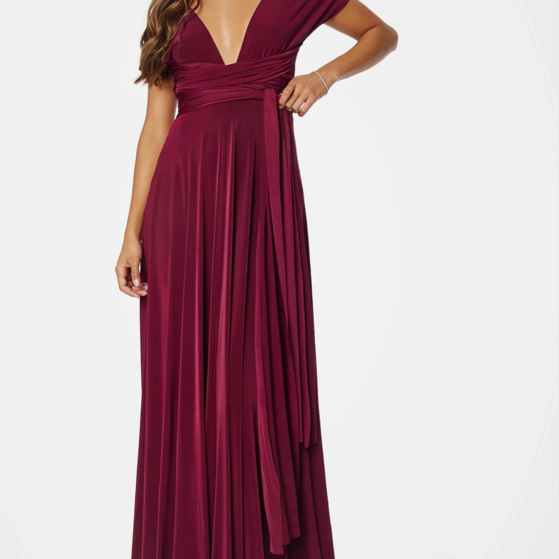 Säljer en vinröd långklänning med omlott och v-ringad hals. Klänningen har ett snyggt fall och breda axelband, samt ett knyt i midjan som ger en elegant siluett. Materialet är mjukt och har en lätt glans, perfekt för bal eller fest.