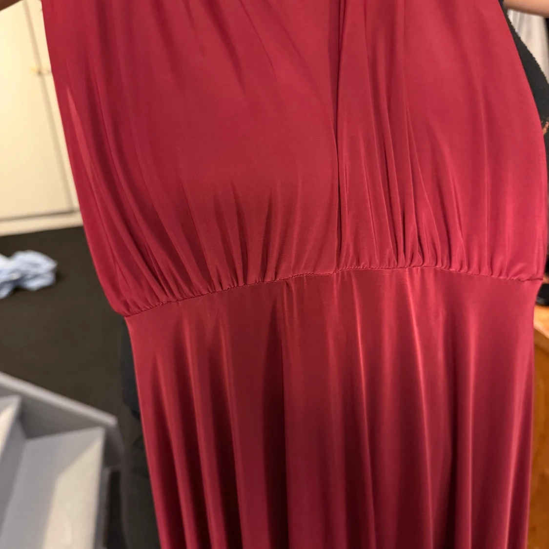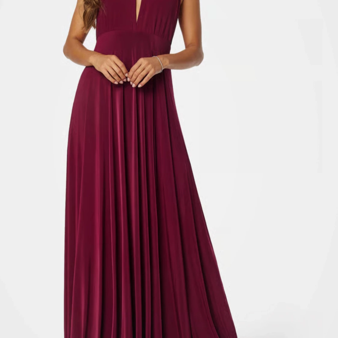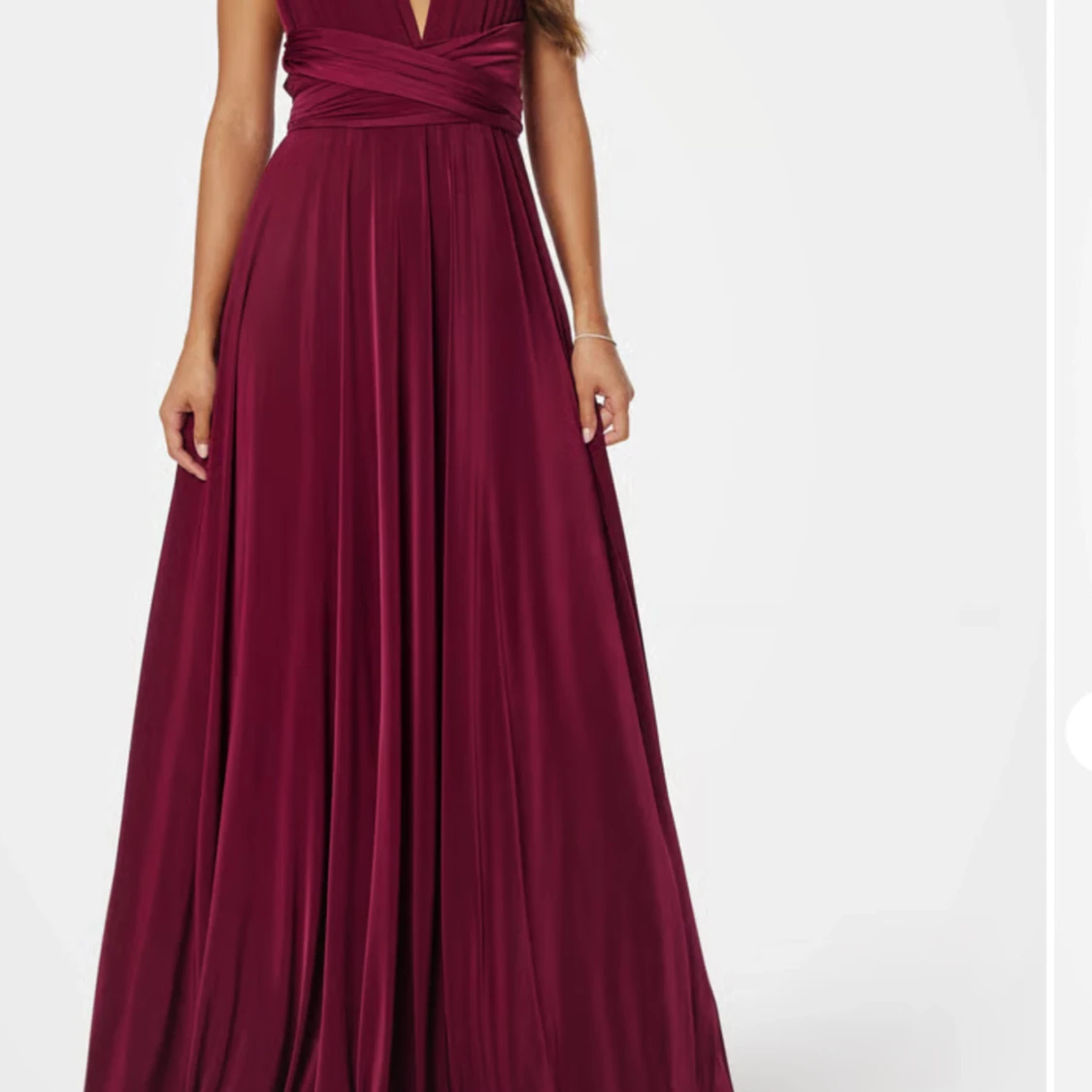 Säljer en vinröd långklänning med omlott och v-ringad hals. Klänningen har ett snyggt fall och breda axelband, samt ett knyt i midjan som ger en elegant siluett. Materialet är mjukt och har en lätt glans, perfekt för bal eller fest.