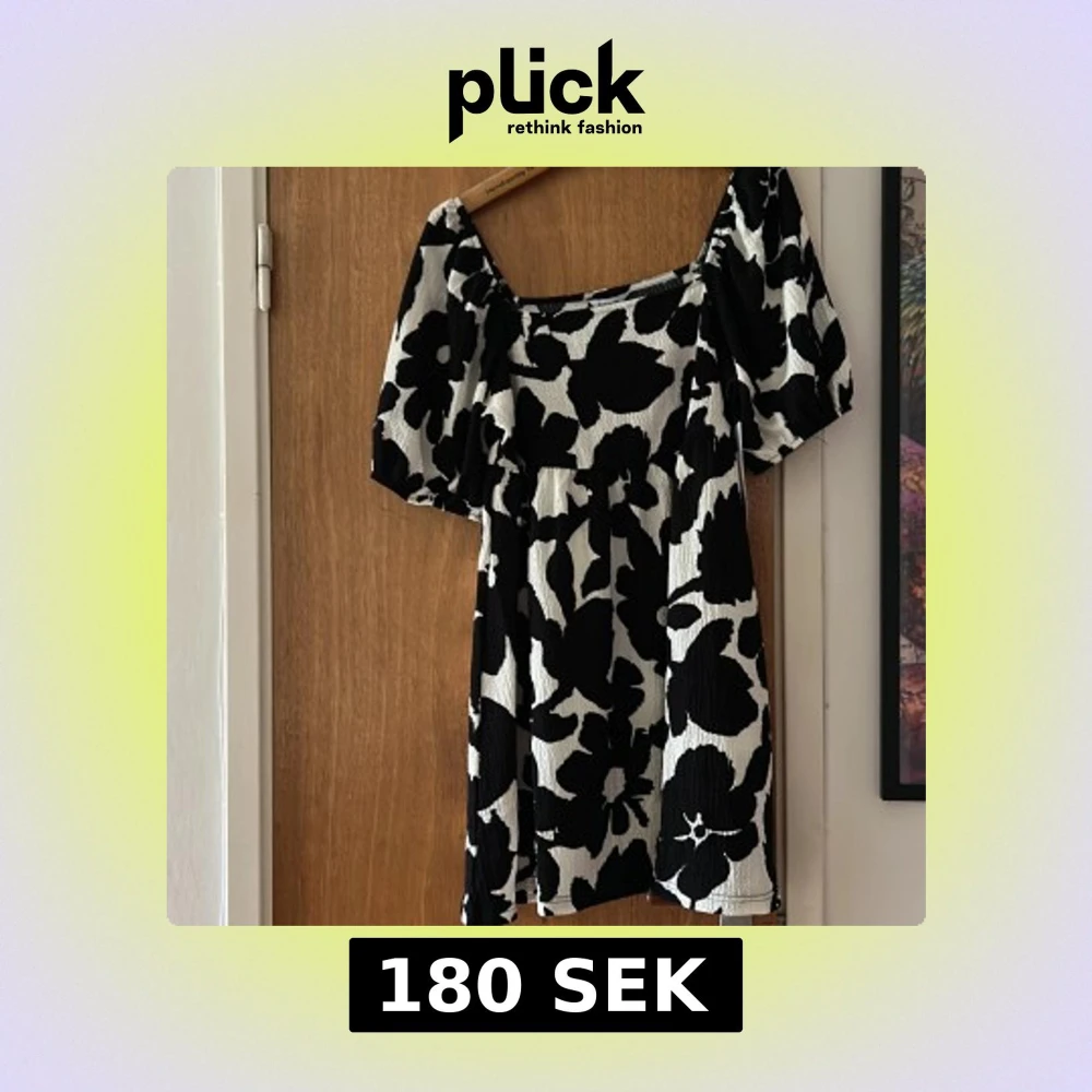 Supersnygg kort klänning från Bubbleroom med svartvita stora blommor. Puffiga korta ärmar och fyrkantig urringning ger en trendig vibe. Materialet är lätt strukturerat och känns bekvämt mot huden. Perfekt för dig som gillar att sticka ut med mönster. Aldrig använt.