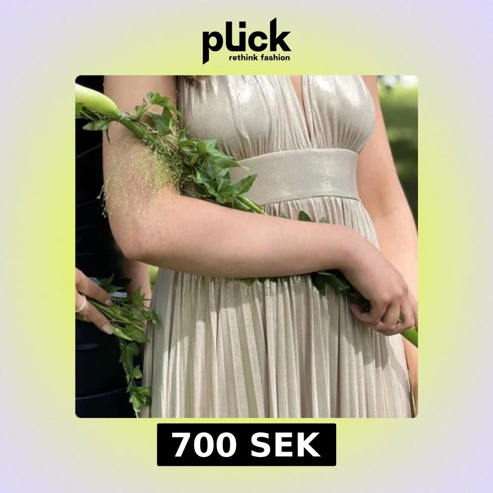 Elegant champagnefärgad långklänning med djup v-ringning och öppen rygg. Klänningen har ett brett band i midjan och ett vackert fall som ger en lyxig känsla. Perfekt för speciella tillfällen.