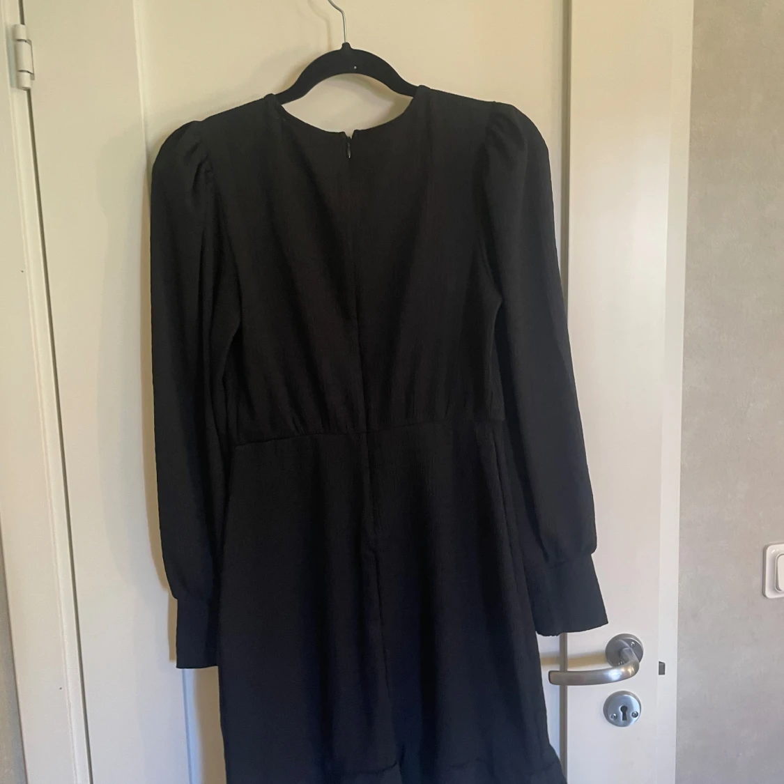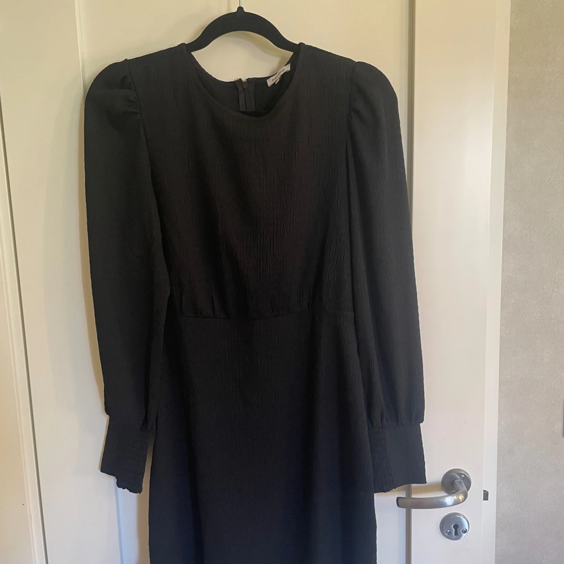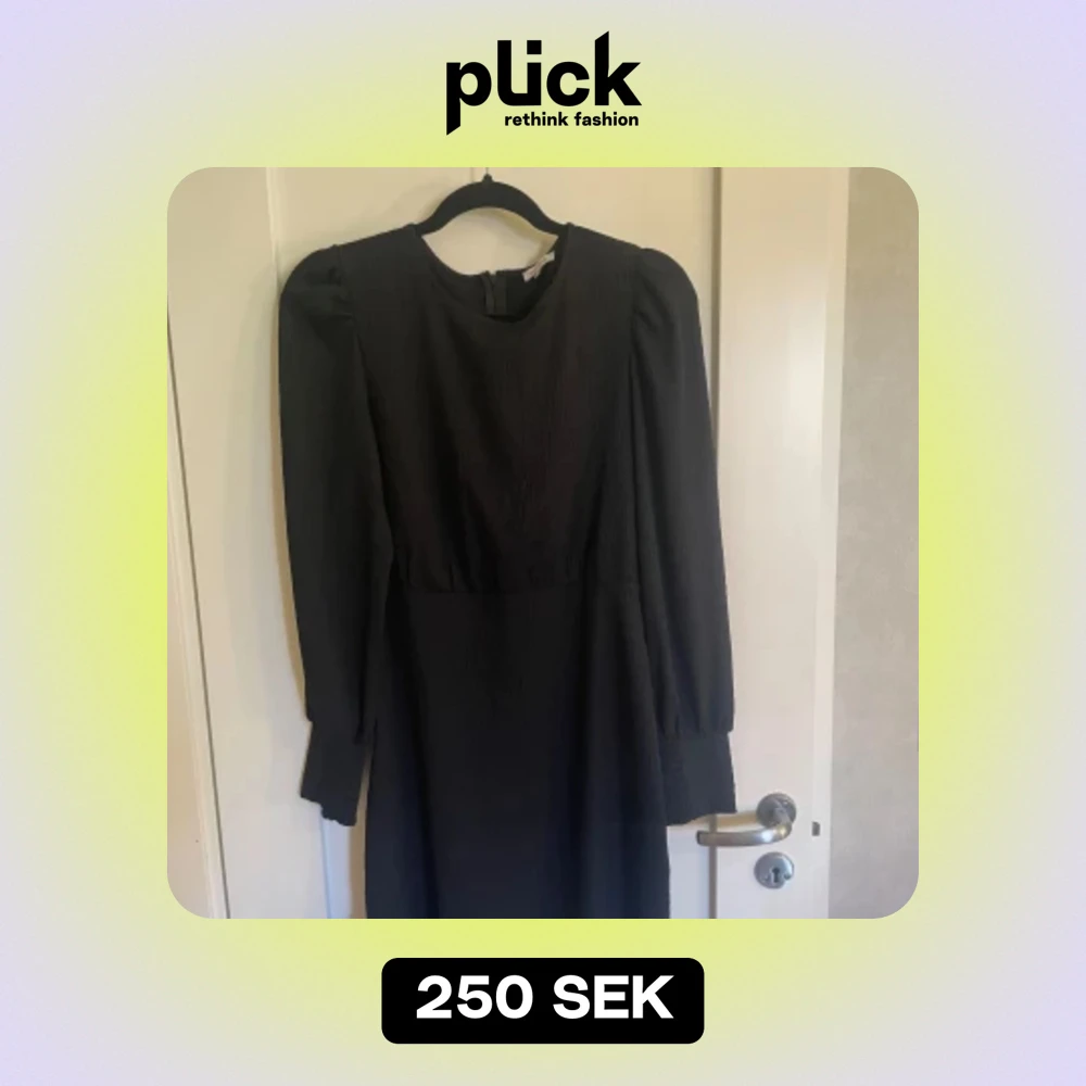 Säljer en svart långärmad klänning. Den har en enkel men stilren design med en rund hals och långa puffärmar. Perfekt för höst- och vinterfester eller andra formella tillfällen. Klänningen är i nyskick och har en normal passform.