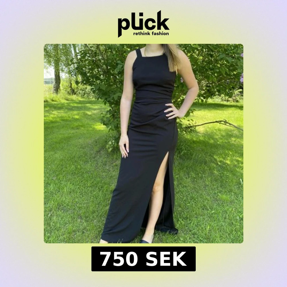 Svart långklänning med breda axelband och fyrkantig halsringning. Klänningen har en snygg slits på ena sidan och en öppen rygg. Materialet är mjukt och följsamt, vilket ger en slim passform. Perfekt för dig som vill ha en stilren och elegant look. Använd endast 1 gång.