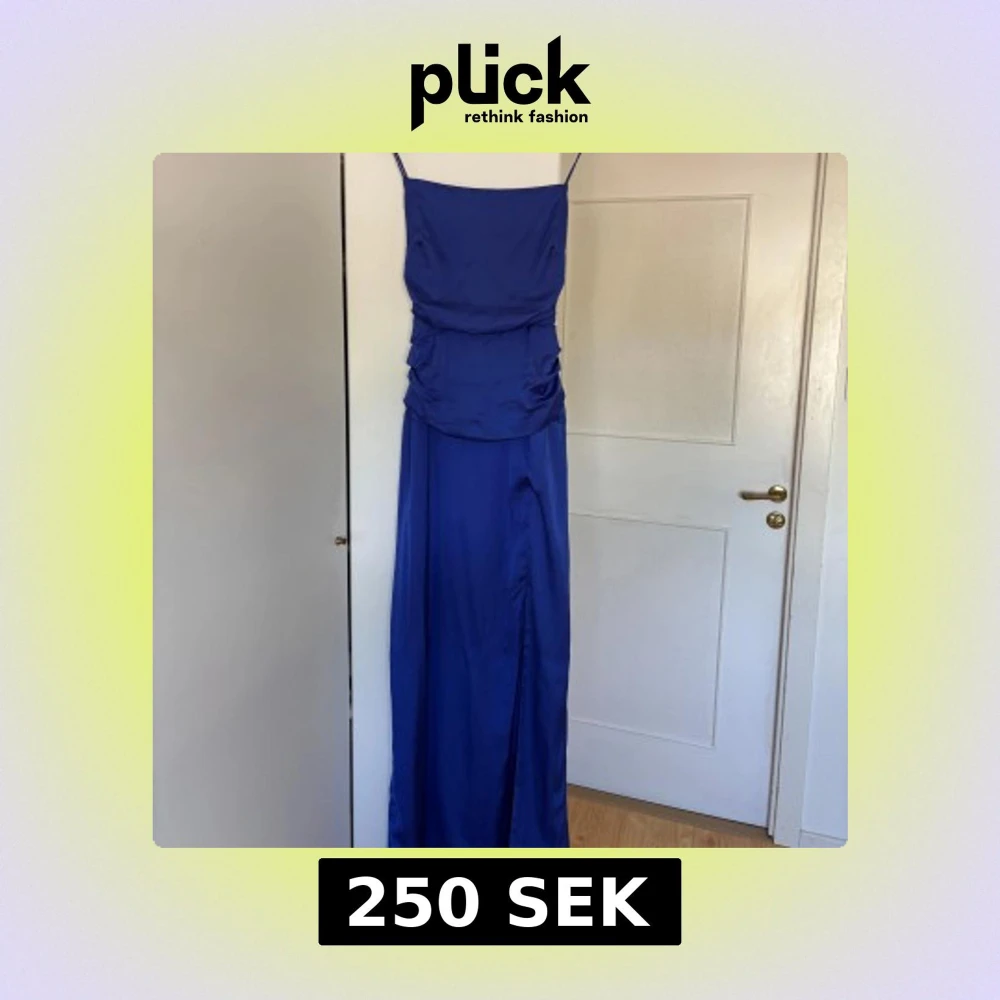 Säljer en elegant blå långklänning med smala axelband och rynkade detaljer framtill. Klänningen har en slits och är tillverkad i ett glansigt material som ger en lyxig känsla. Perfekt för festliga tillfällen.