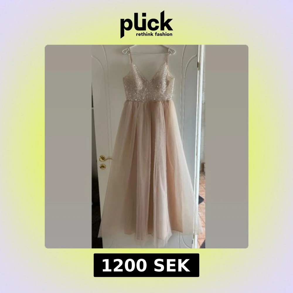 Säljer nu min älskade balklänning som endast är använd en gång! Klänningen är cremefärgad med rosa/ beiga toner och har glittrig paljettöverdel med v-ringning. Kjolen är i flera lager tunn tyll som ger en prinsessform. Smala axelband och dragkedja i ryggen, samt inlägg för brösten så ingen bh behövs. Ryggen är djupt v- ringad vilket ger klänningen en fantastisk form. Köpt från Bubbleroom för 3000kr.(Är 176cm lång och längden är lagom, skulle passa någon upp till 180, går även sy upp för kortare)