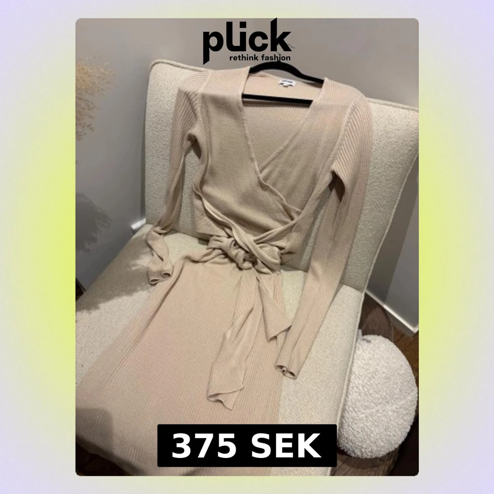 Supersnygg beige omlottklänning från Bubbleroom i ribbad bomull. Klänningen har lång ärm, v-ringning och ett brett knytband i midjan som ger en smickrande siluett. Perfekt för dig som gillar stilrena och bekväma plagg.