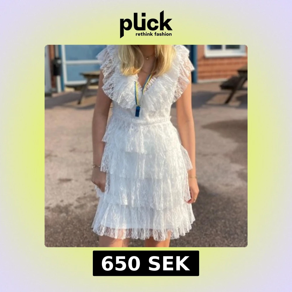 Superfin vit kortklänning i spets med flera lager volanger och v-ringning. Klänningen har pärlknappar i ryggen och är ärmlös med bred volangkant. Perfekt för student eller sommarens alla tillfällen. Klänningen är ifrån bubbelroom men jag har varit att ta bort spärrarna där fram, gjort av en skräddare.