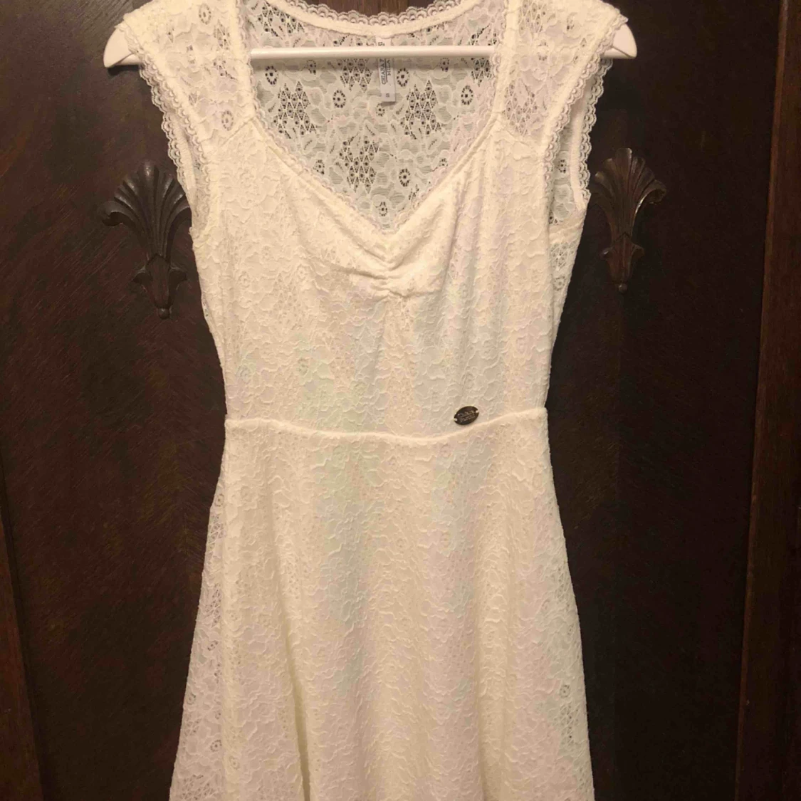 Fin vit klänning som är perfekt till student/skolavslutning och sommaren. Använd endast en gång och är i fint skick! Spetsdetaljer med en liten v-ringning. Fler bilder kan skickas!