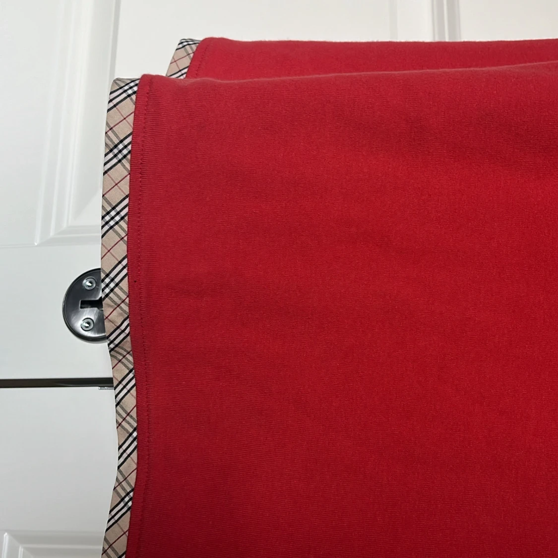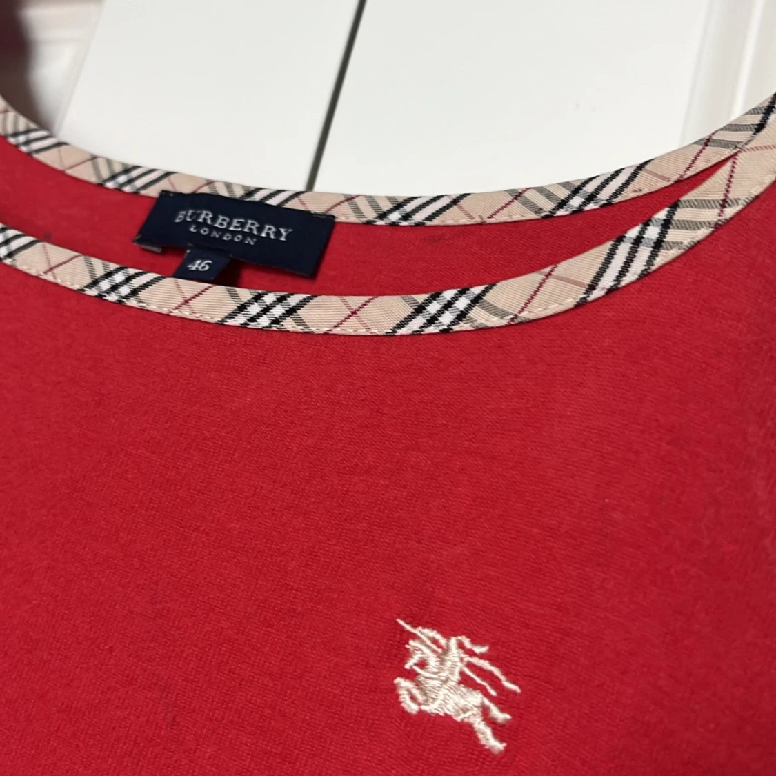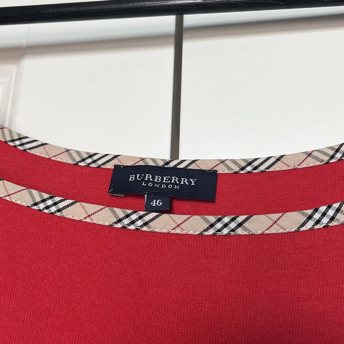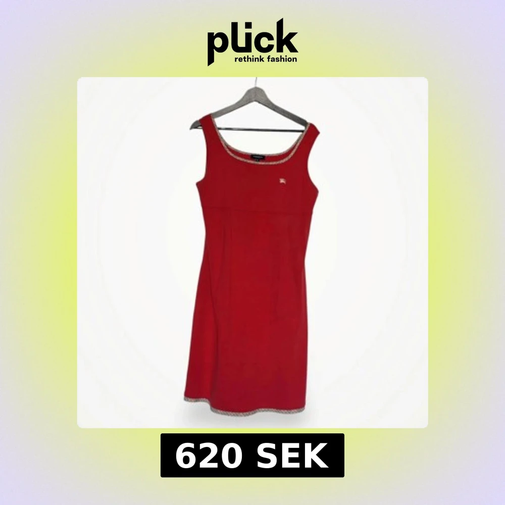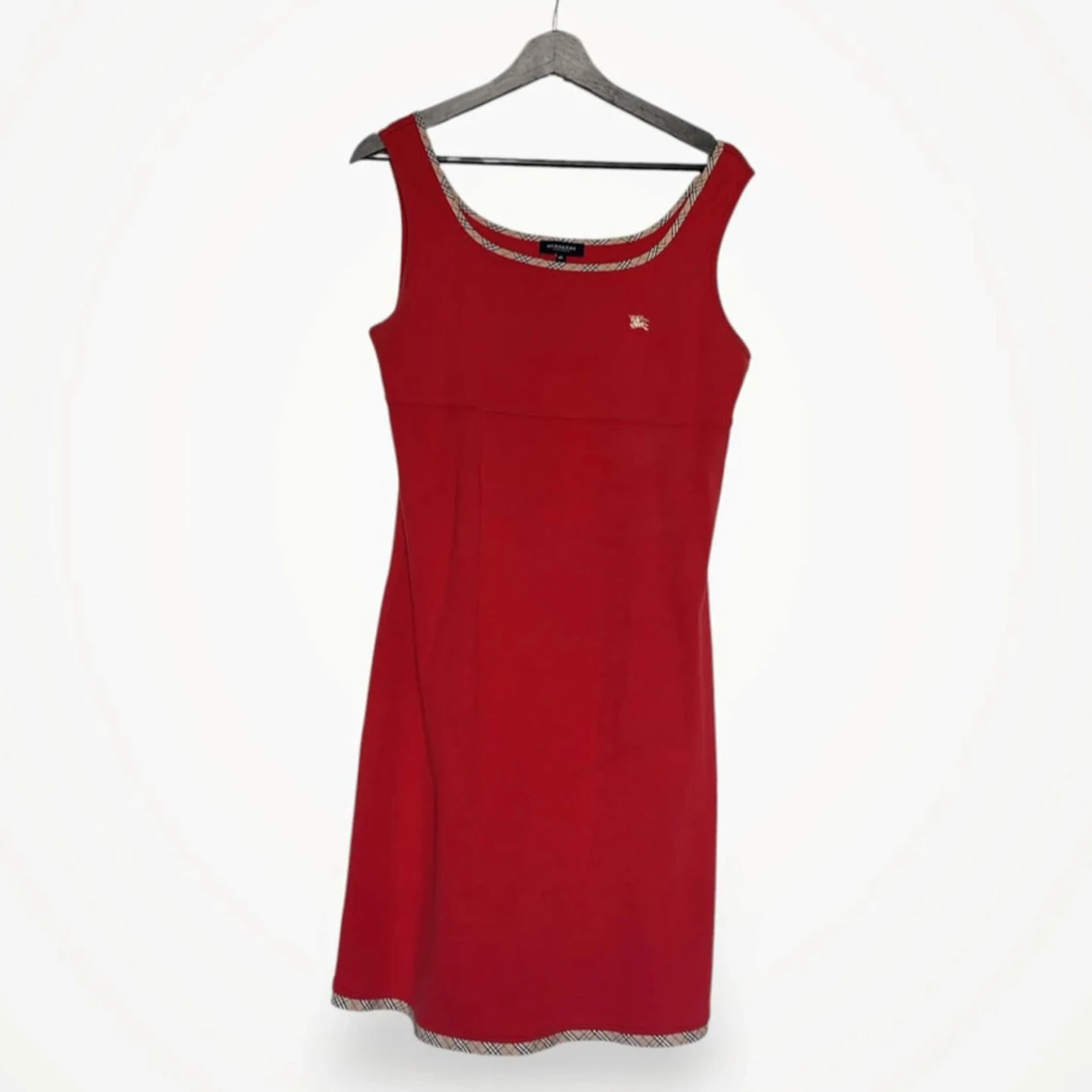 Supersnygg röd klänning från Burberry London med klassiska rutiga detaljer vid halsringning och fåll. Ärmlös modell i mjukt material, med broderad Burberry-logga framtill. Perfekt för dig som vill sticka ut med en ikonisk och tidlös look.