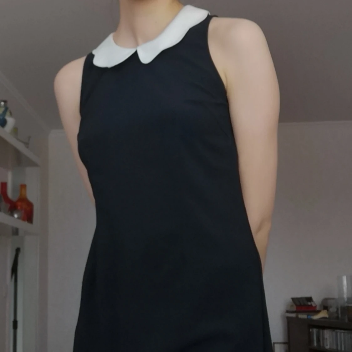 Svart klänning med vit krage, köpt på Shock i Sthlm för 800 kr. Jättefint skick, nästan helt oanvänd.
