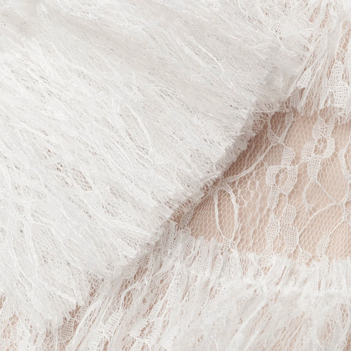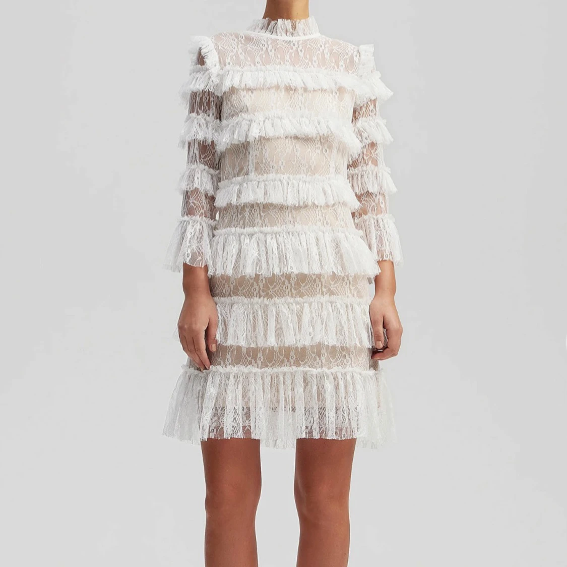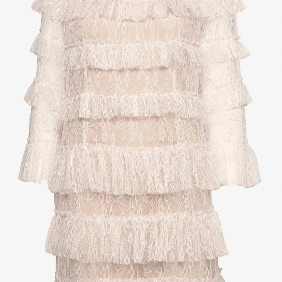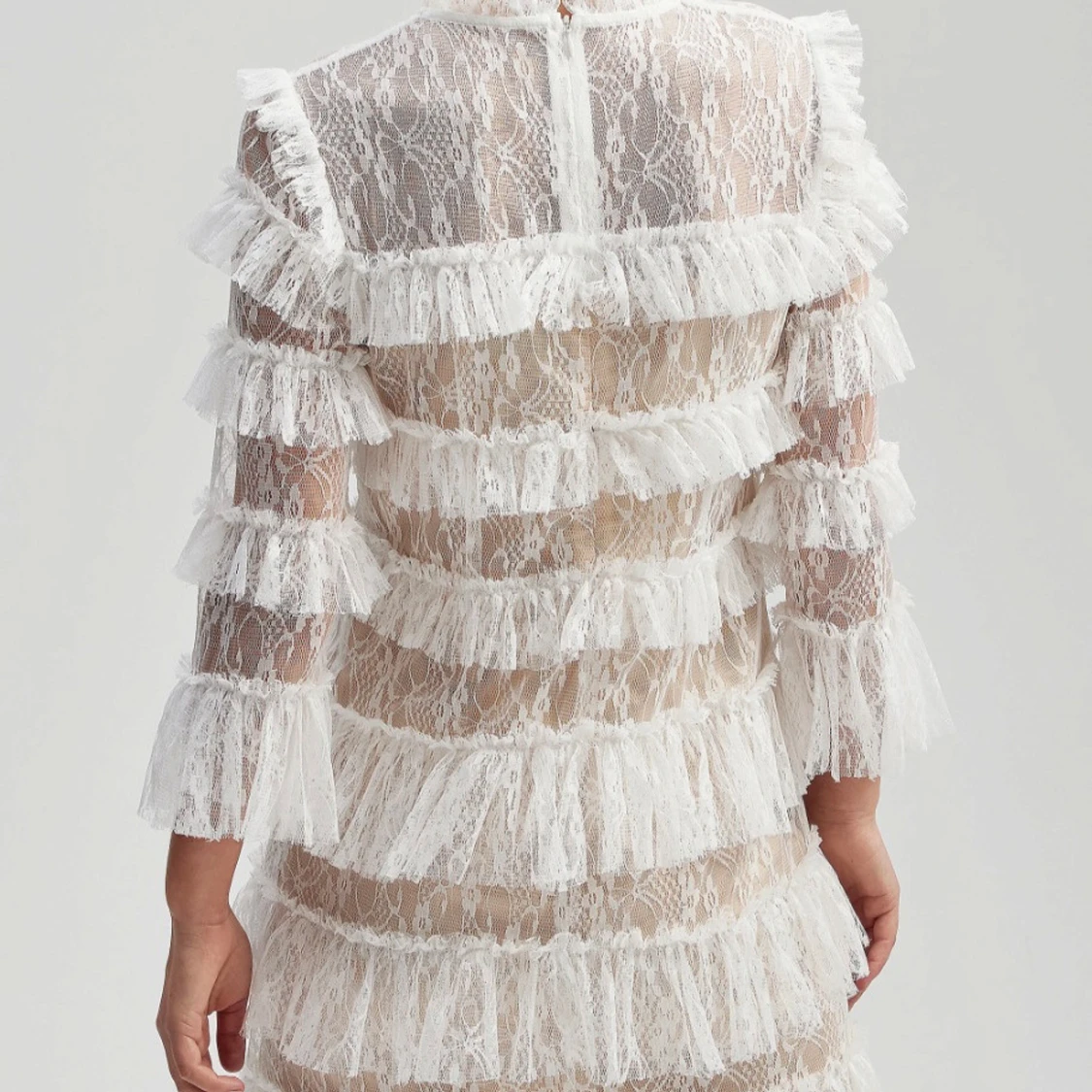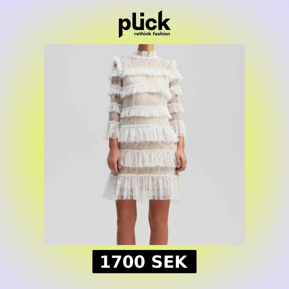 Supersnygg kort klänning i vit spets med transparenta partier och flera lager volanger. Klänningen har lång ärm, hög hals och ett romantiskt mönster i spetsen. Materialet är lätt och ger en lyxig känsla, perfekt för dig som vill sticka ut med en unik look.