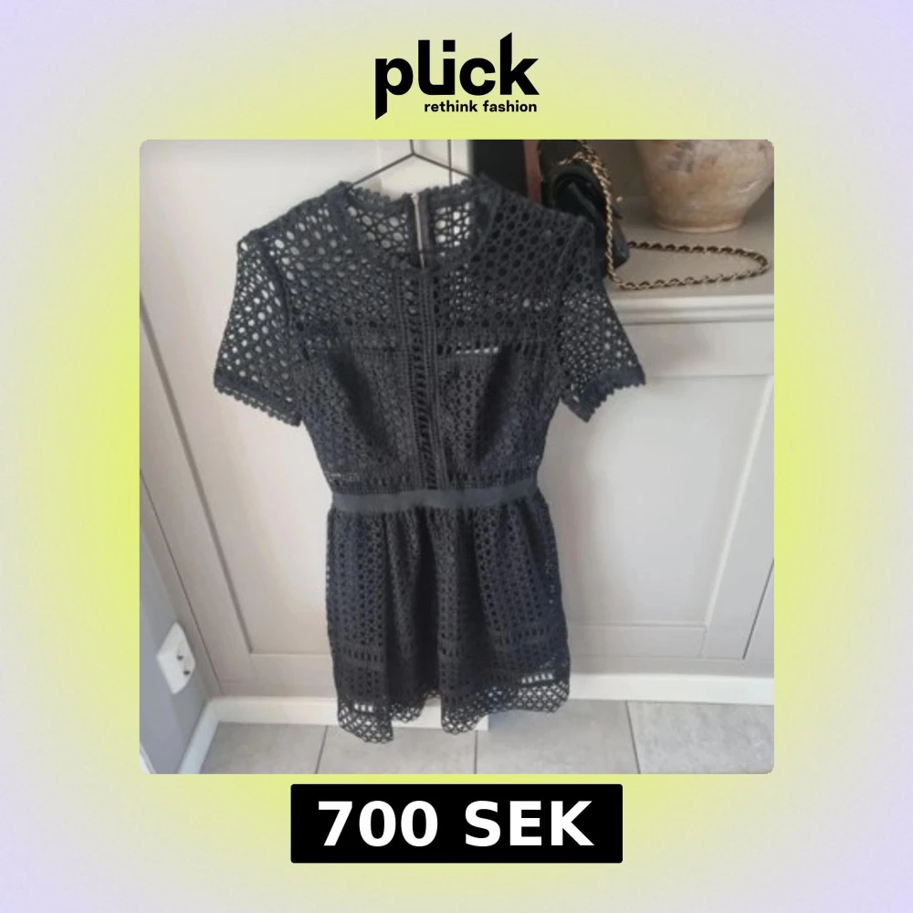 Supersnygg svart kortklänning med genombruten spets och rund hals. Klänningen har korta ärmar och markerad midja, perfekt för dig som gillar en trendig och feminin look. Dragkedja bak för enkel påklädning. Sparsamt använd.