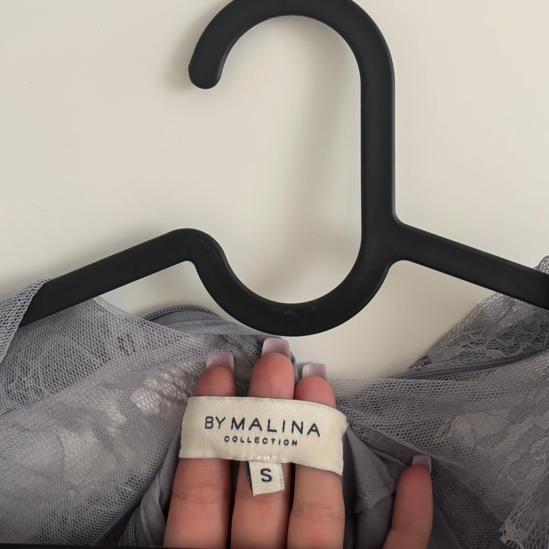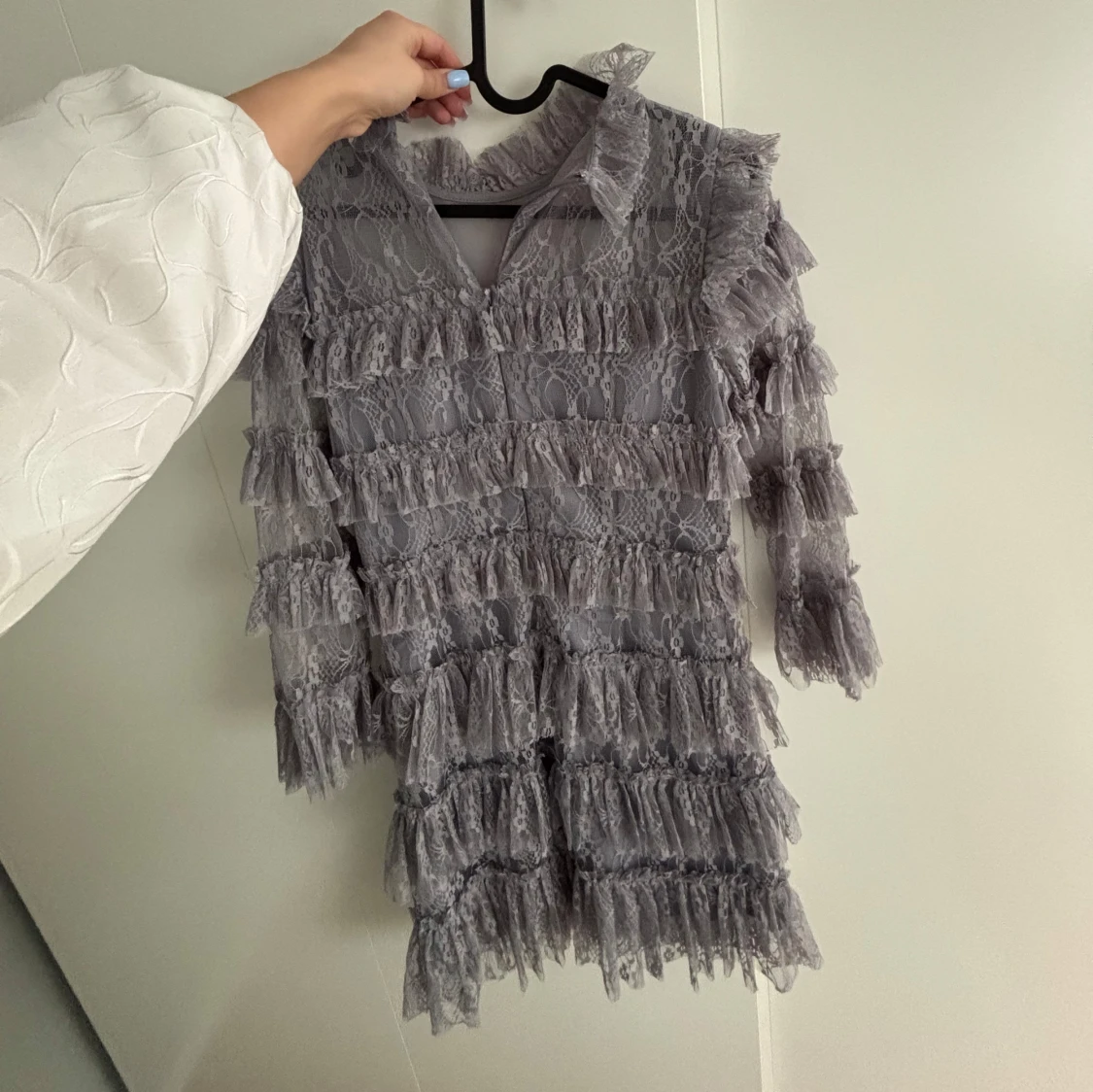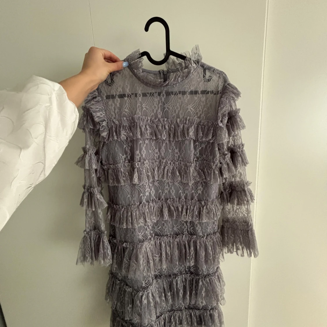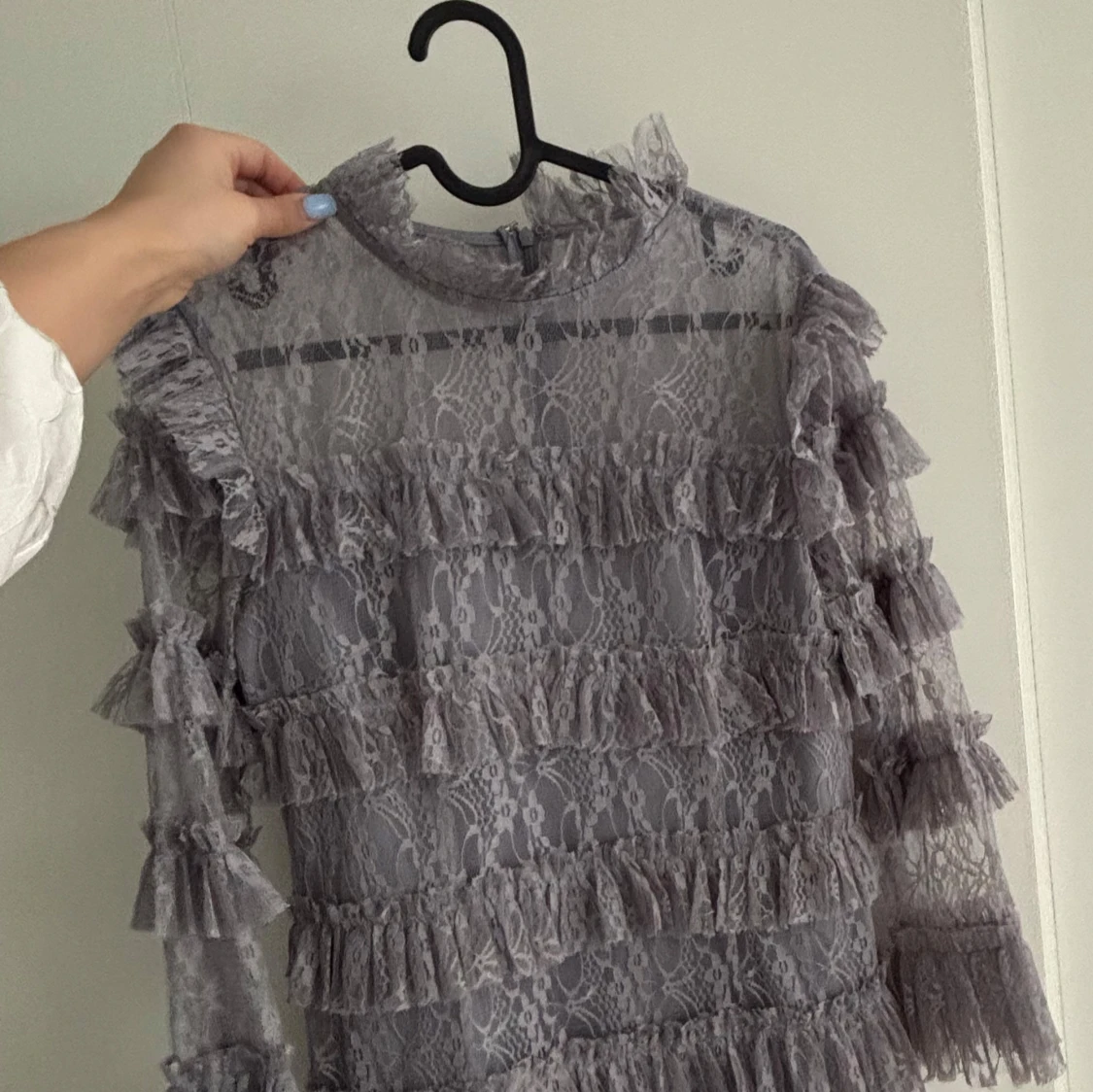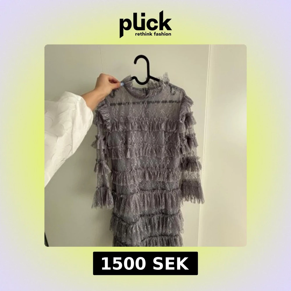 Supersnygg grå/lila spetsklänning från By Malina i storlek S. Klänningen har halvlånga ärmar, hög hals och är täckt av volanger i flera lager. Materialet är genombruten spets. Såljer då jag aldrig fått användning av den🥰
