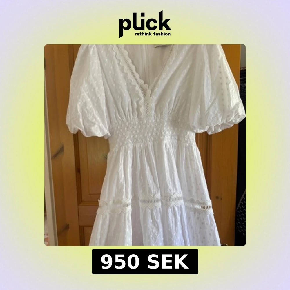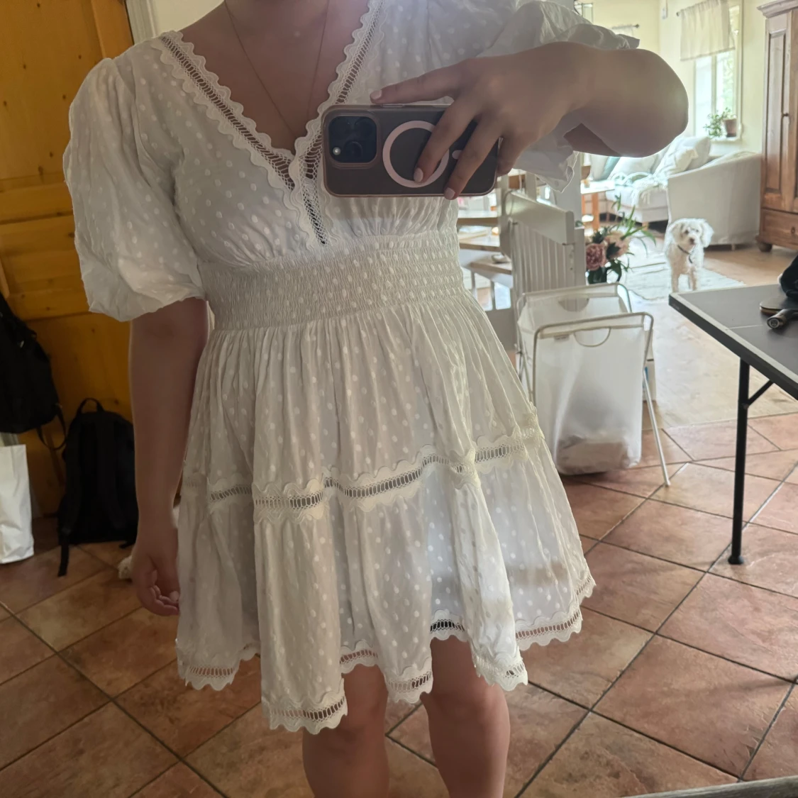 Supersöt vit sommarklänning med puffärmar, v-ringning och broderade spetsdetaljer. Klänningen har ett diskret prickigt mönster. Perfekt för sommarens alla tillfällen!