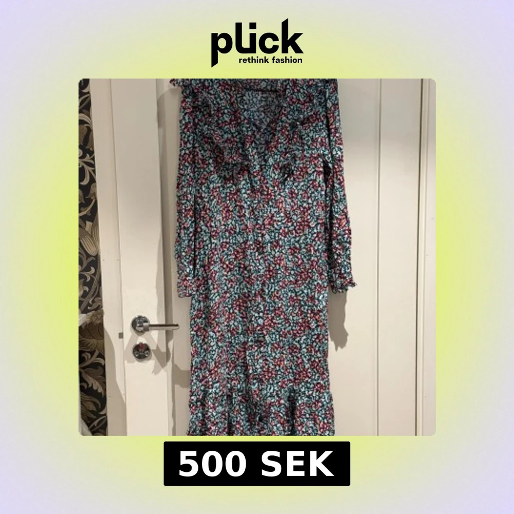 Säljer en färgglad långklänning från By Malina med blommigt mönster i blått, rosa, vitt och orange. Klänningen har volangdetaljer vid halsen och nederkanten, v-ringning och långa ärmar. Perfekt för dig som gillar boho-vibe och vill sticka ut med en unik look.