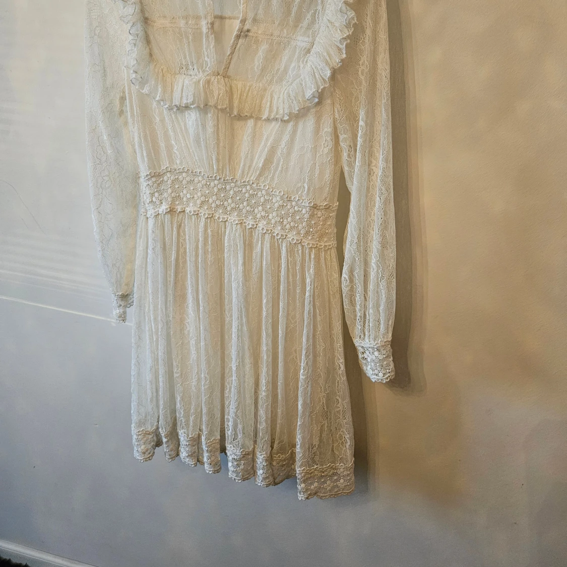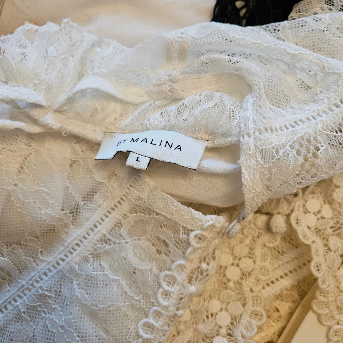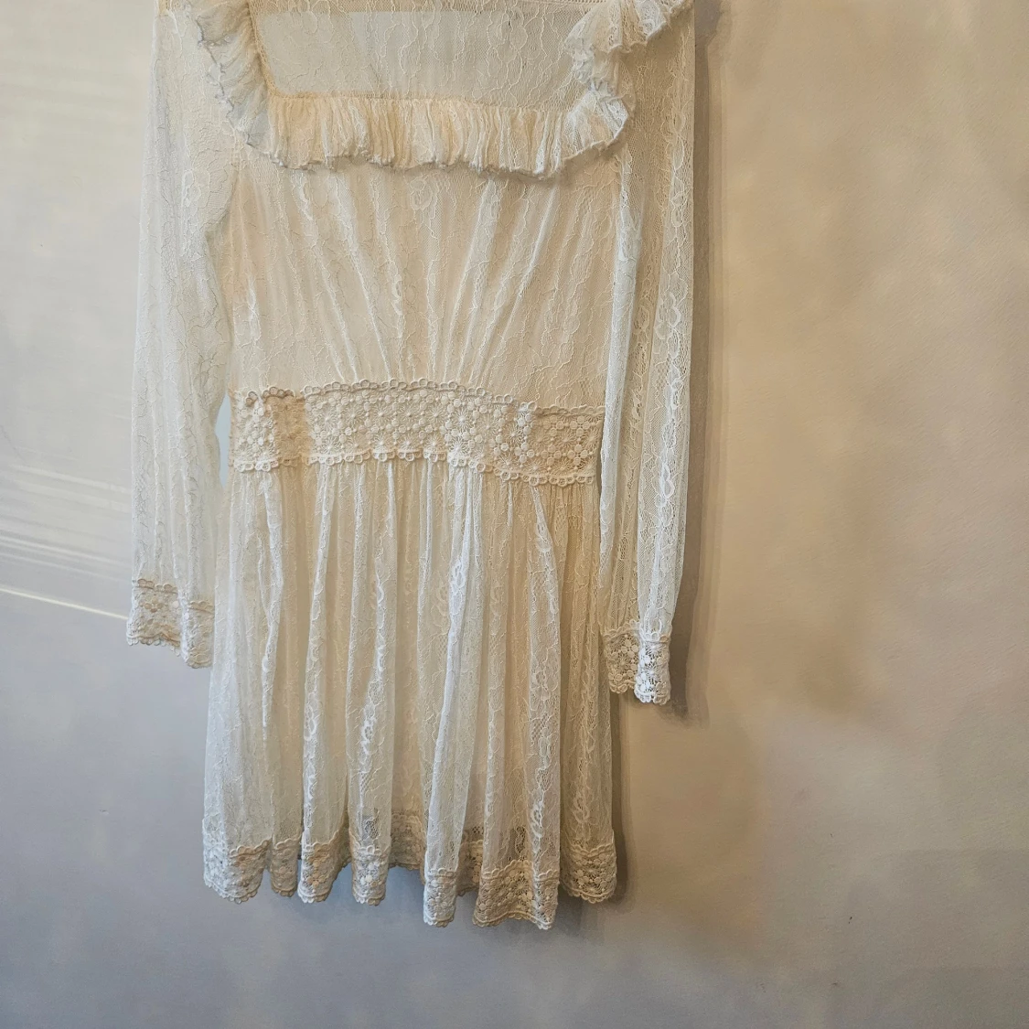 Superfin vit spetsklänning från By Malina med romantiska volangdetaljer, markerad midja med broderade blommor och långa ärmar. Klänningen har en kort längd och är helfodrad med transparent spets över hela. Perfekt för dig som gillar en feminin och bohemisk stil.