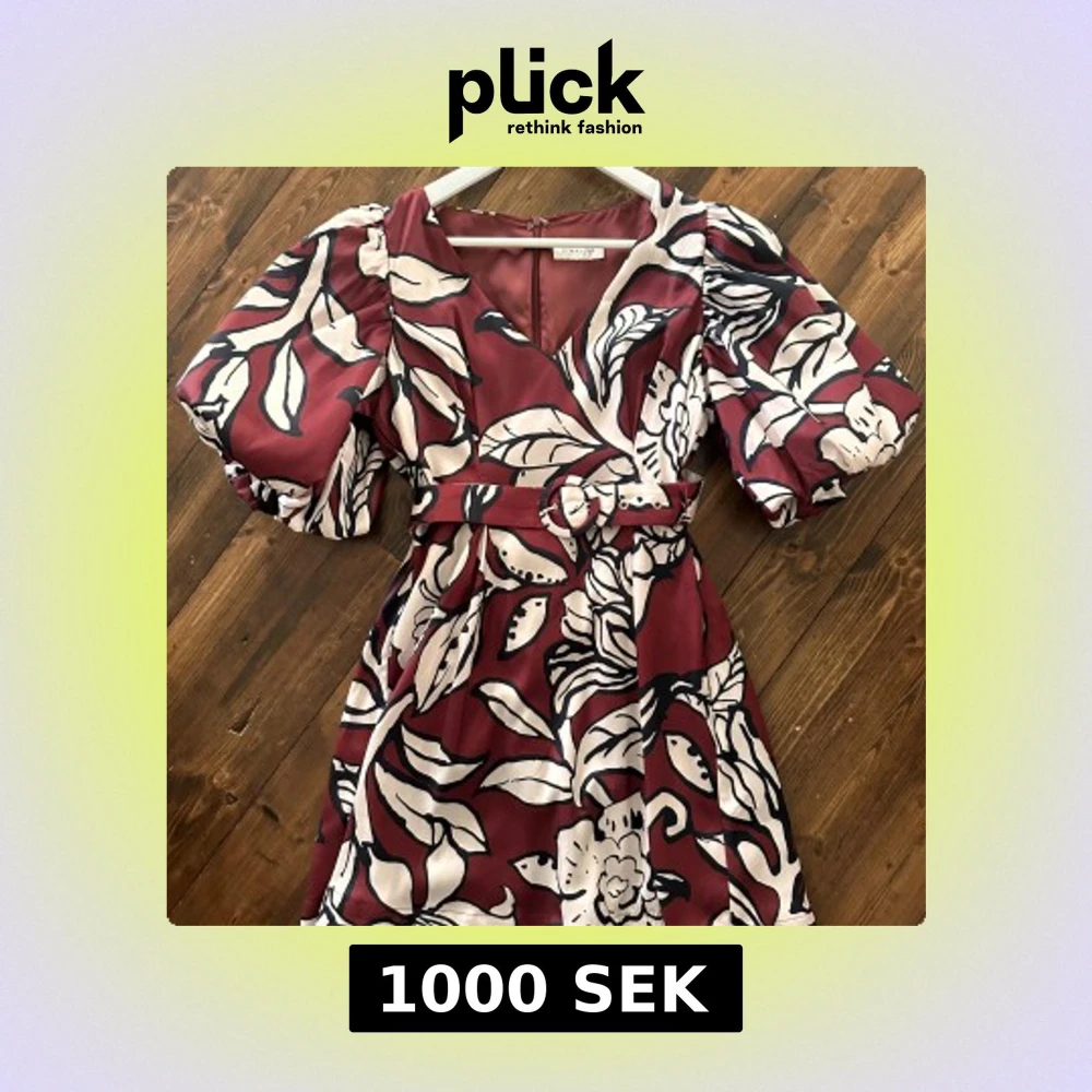 Säljer en vinröd omlottklänning från By Malina med stora vita och svarta blommönster. Klänningen har puffiga korta ärmar, v-ringning och ett matchande bälte i midjan. Perfekt för dig som vill sticka ut!