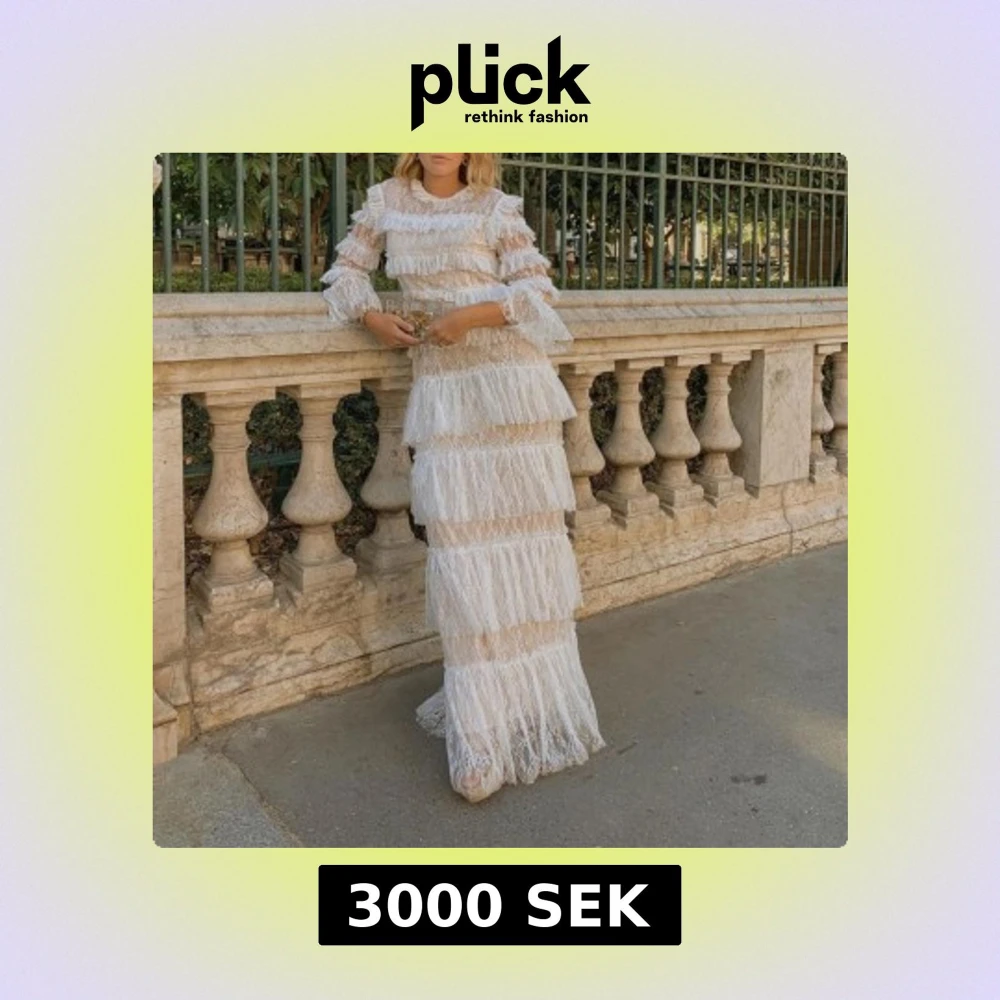 Drömmig långklänning i vit spets med flera lager volanger och utsvängda ärmar. Klänningen har en romantisk känsla med transparent spets och rund halsringning. Perfekt för dig som vill sticka ut med en unik och elegant look. Bröllopsklänning carmine dress