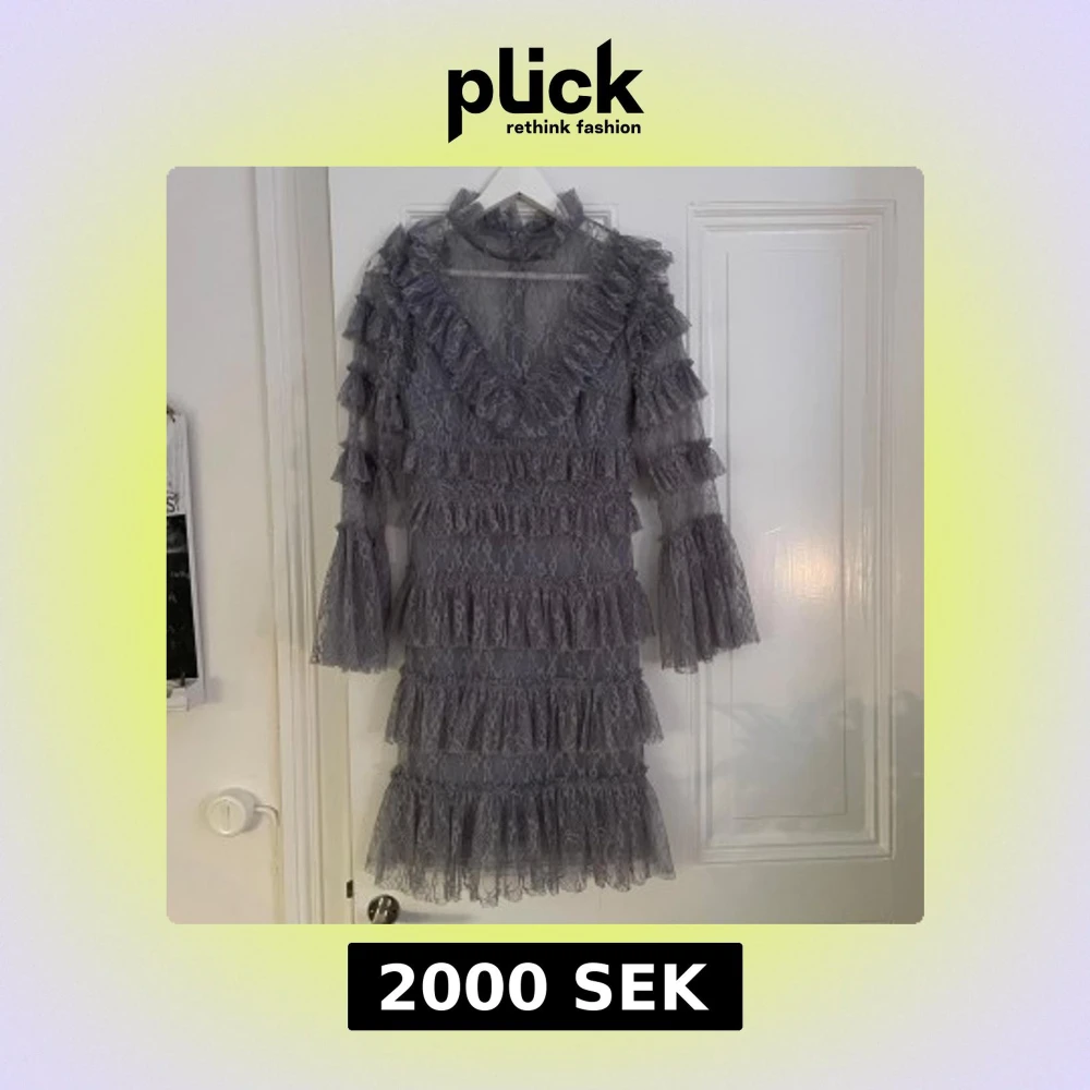 Elegant blå klänning i spets med volanger och långärmad design. Den har en v-ringad hals och flera lager av volanger som ger en romantisk känsla. Perfekt för speciella tillfällen. Helt oanvänd med prislapp kvar. Ordinarie pris 2800kr men slutsåld.