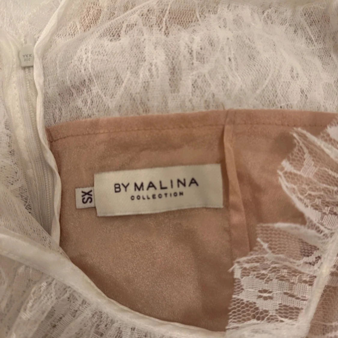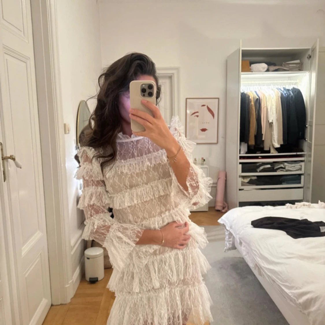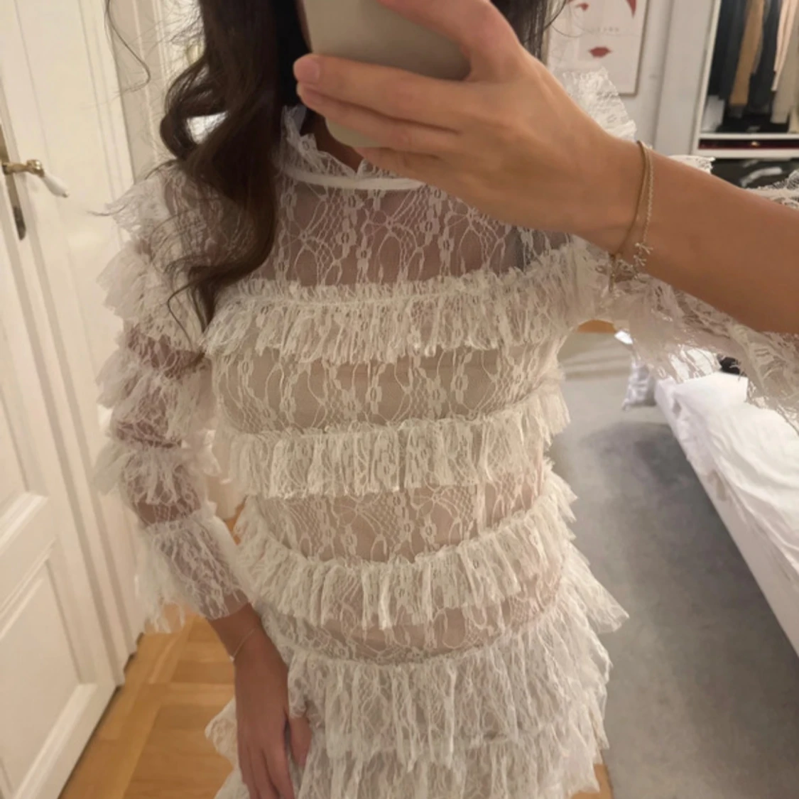 Superfin vit spetsklänning från By Malina med volangdetaljer och lång ärm. Klänningen är kort och har flera lager spets med romantisk känsla. Perfekt för dig som vill sticka ut med en feminin och trendig look.