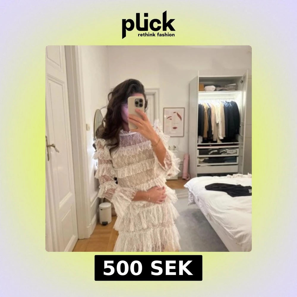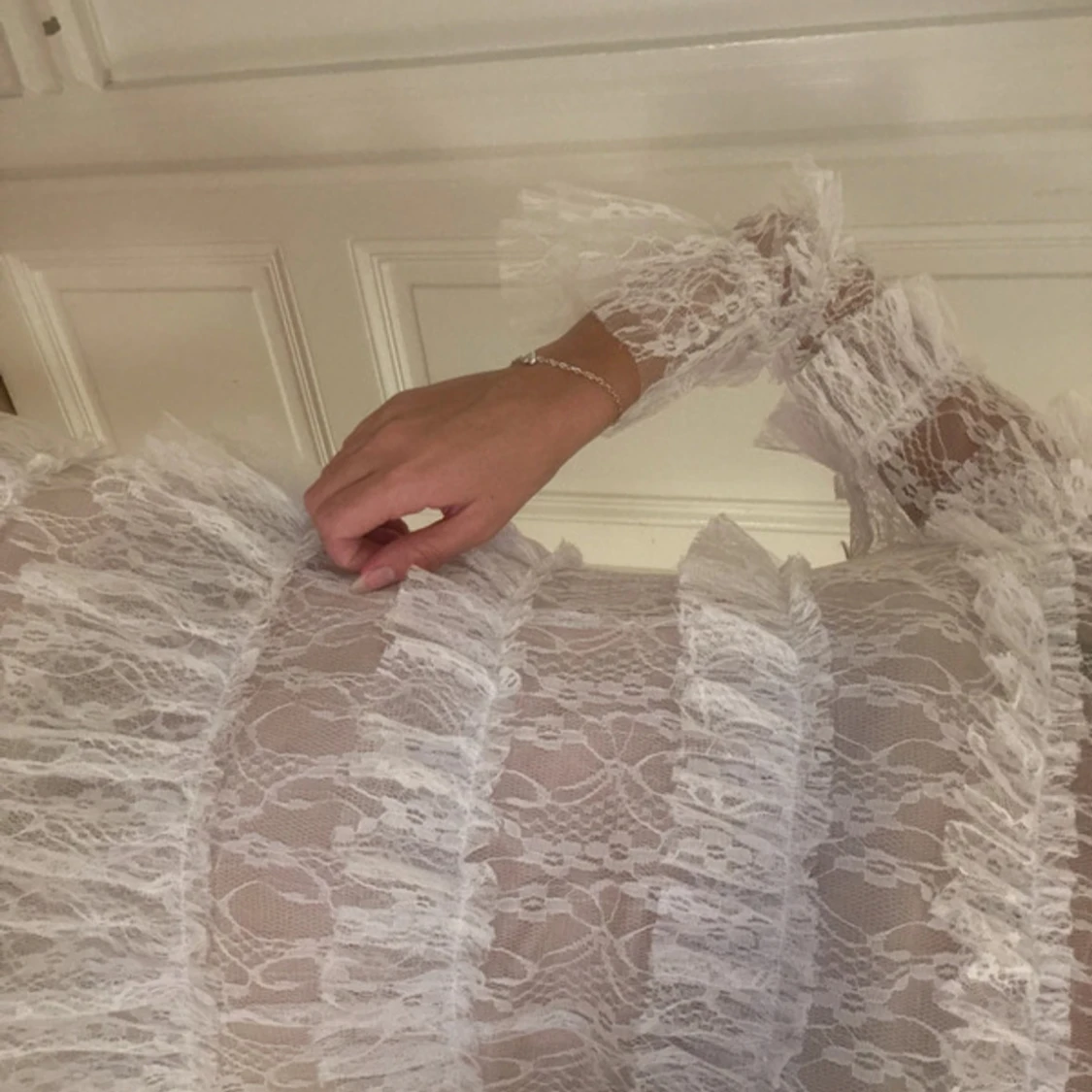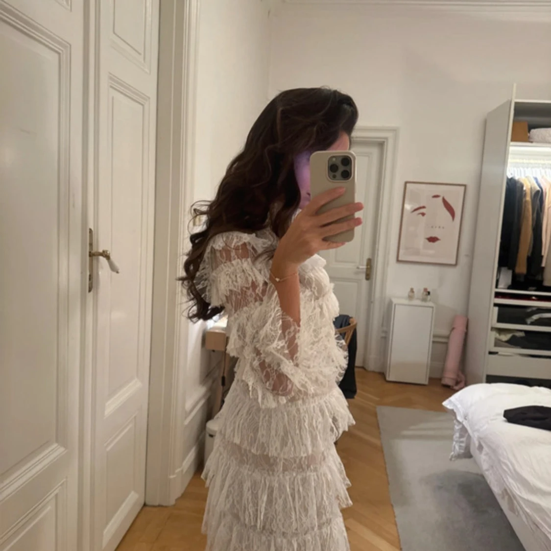 Superfin vit spetsklänning från By Malina med volangdetaljer och lång ärm. Klänningen är kort och har flera lager spets med romantisk känsla. Perfekt för dig som vill sticka ut med en feminin och trendig look.