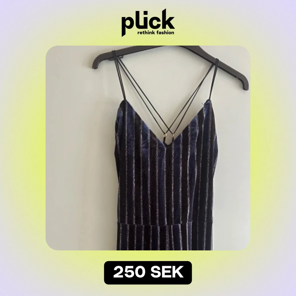 Svart jumpsuit med blåa och silvriga ränder. Vida ben i plyschmaterial. Korsade band i ryggen. Inga tecken på användning.